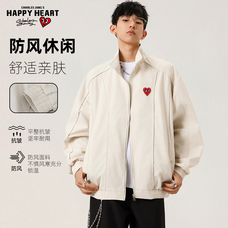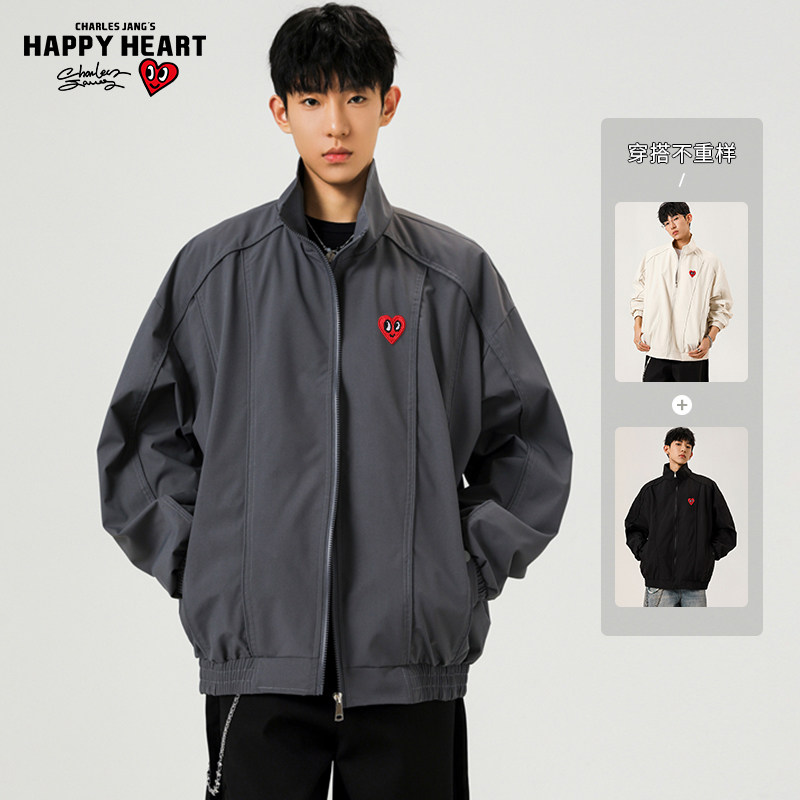 查尔斯桃心 美式翻领拼接纯色夹克男春秋季防风宽松爱心外套衣服