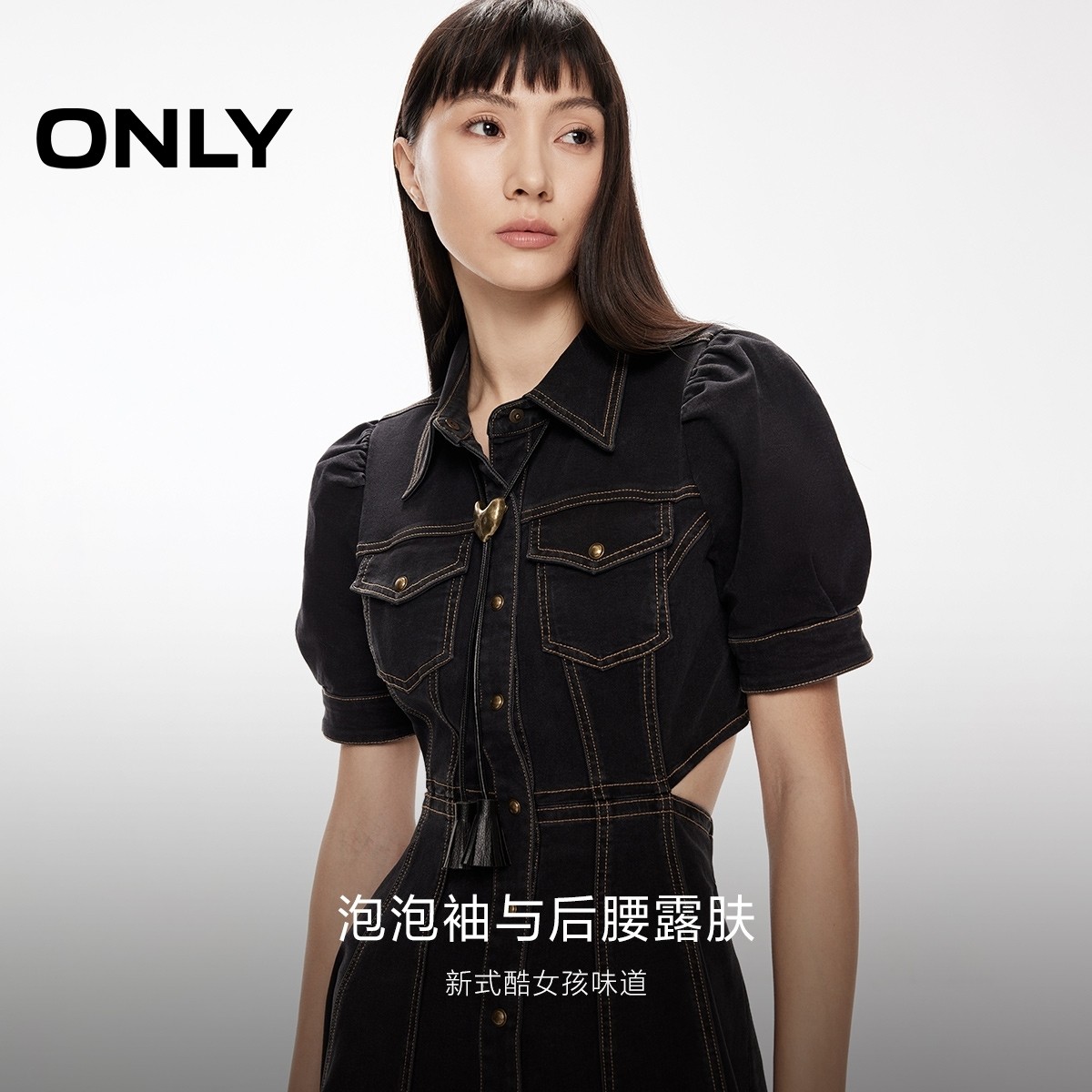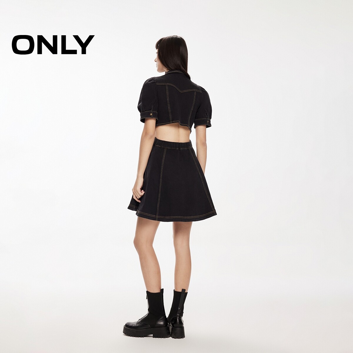 【ONLY奥莱】春夏辣妹风翻领短袖泡泡袖A字显瘦短裙牛仔连衣裙女