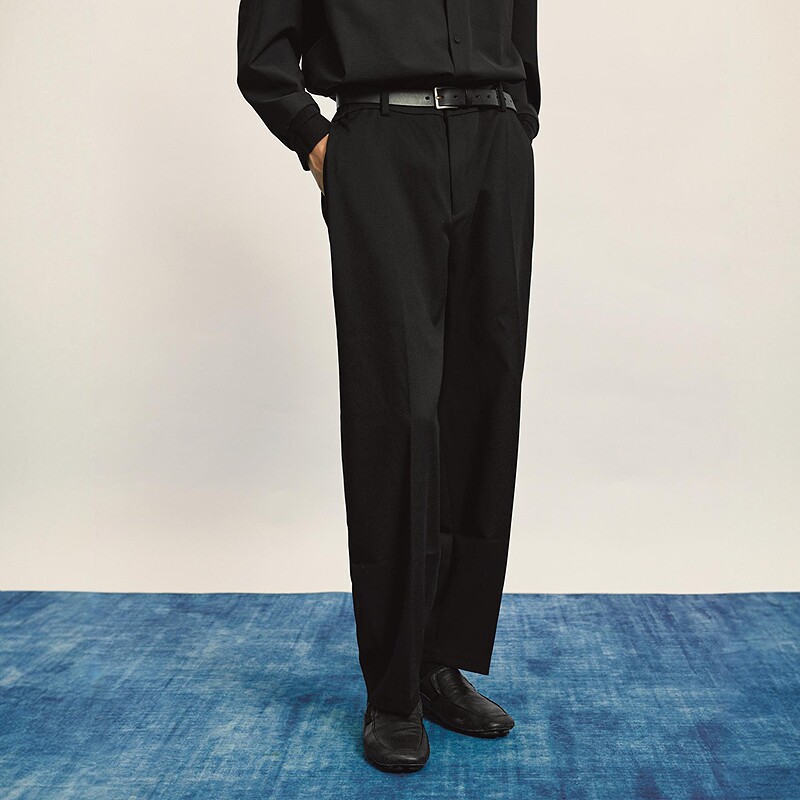 涤粘胶斜纹垂感好,裤腿处微收干净利落