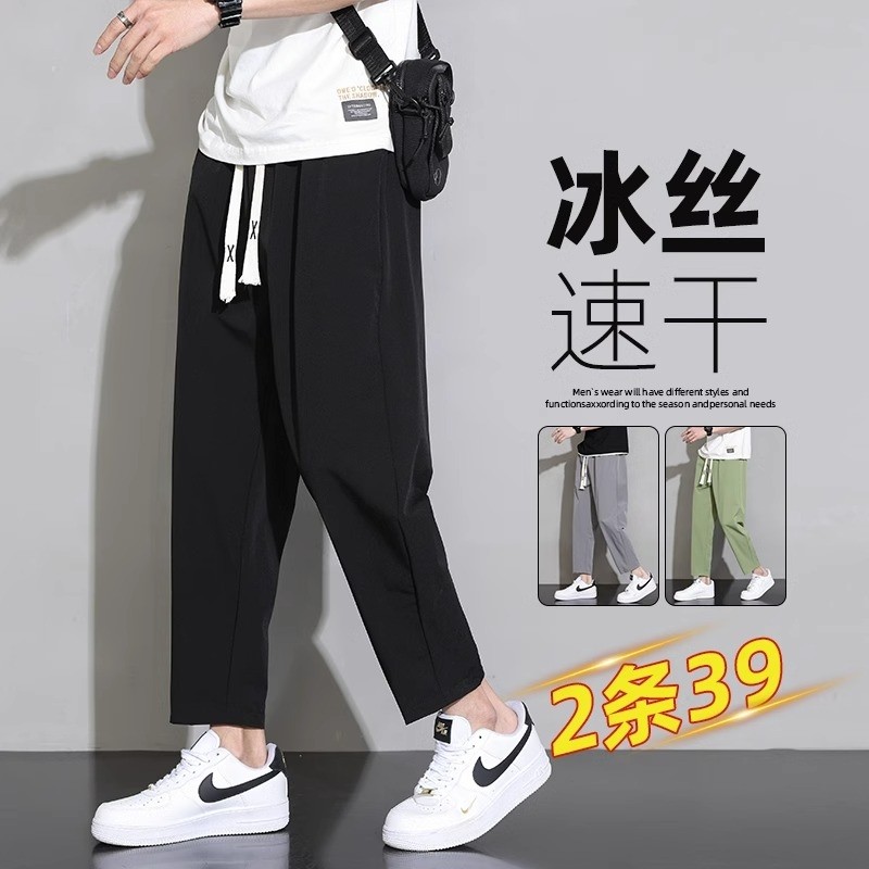 2件】冰丝长裤子男士夏季速干薄款宽松直筒男生运动休闲九分男裤