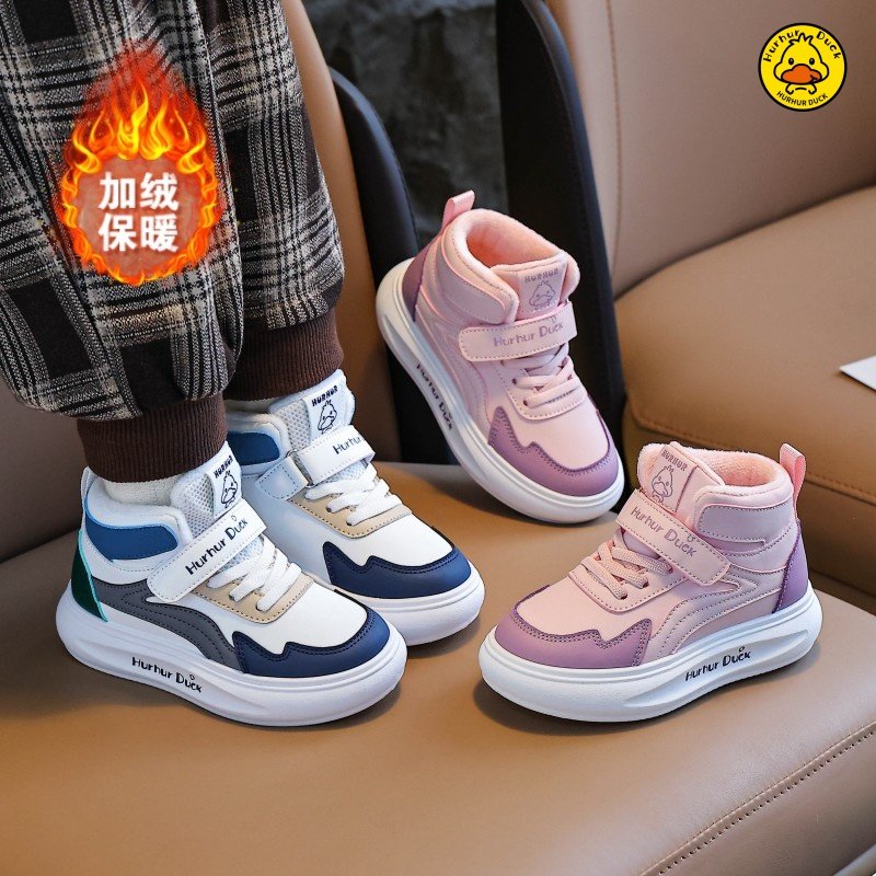 小黄鸭儿童运动鞋冬季皮面防水男女童加绒保暖小跑步鞋潮白色高帮