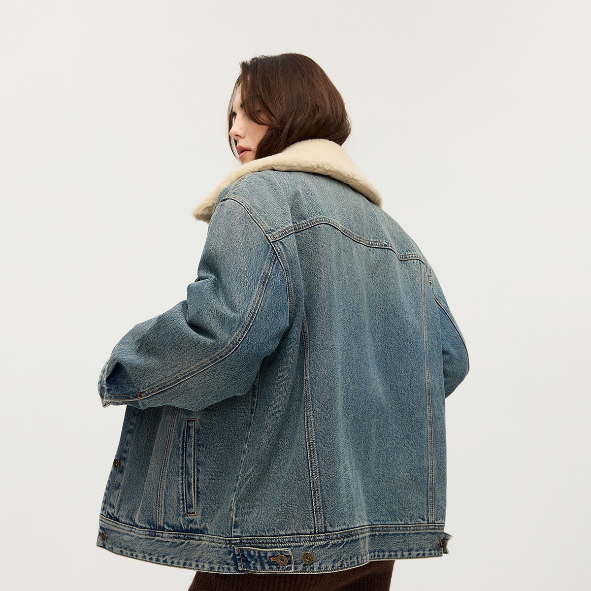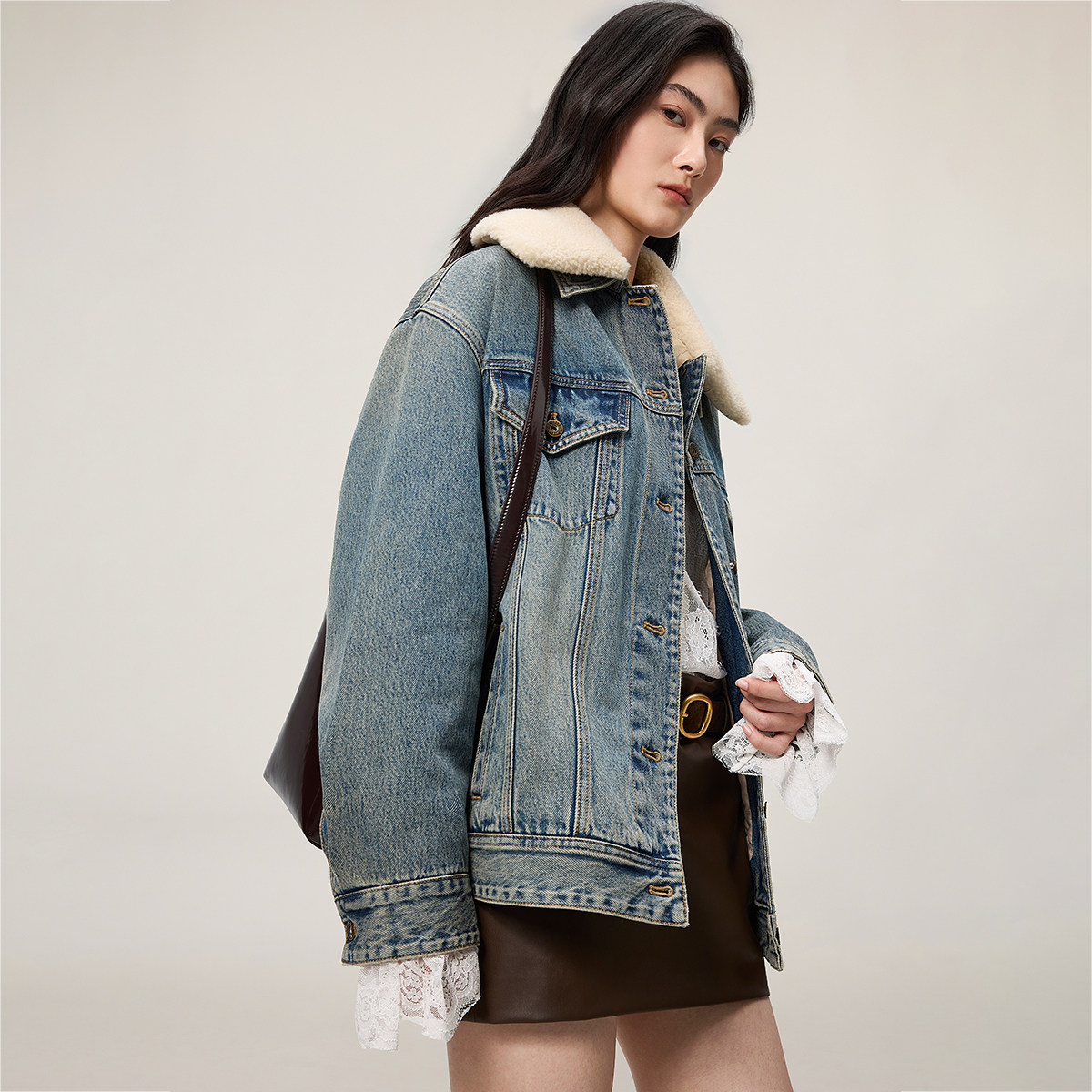 【季末折扣】欧时力可拆卸毛绒翻领棉服牛仔外套休闲2025秋冬新品