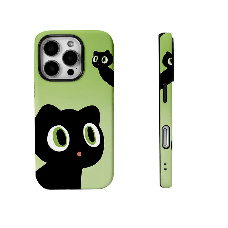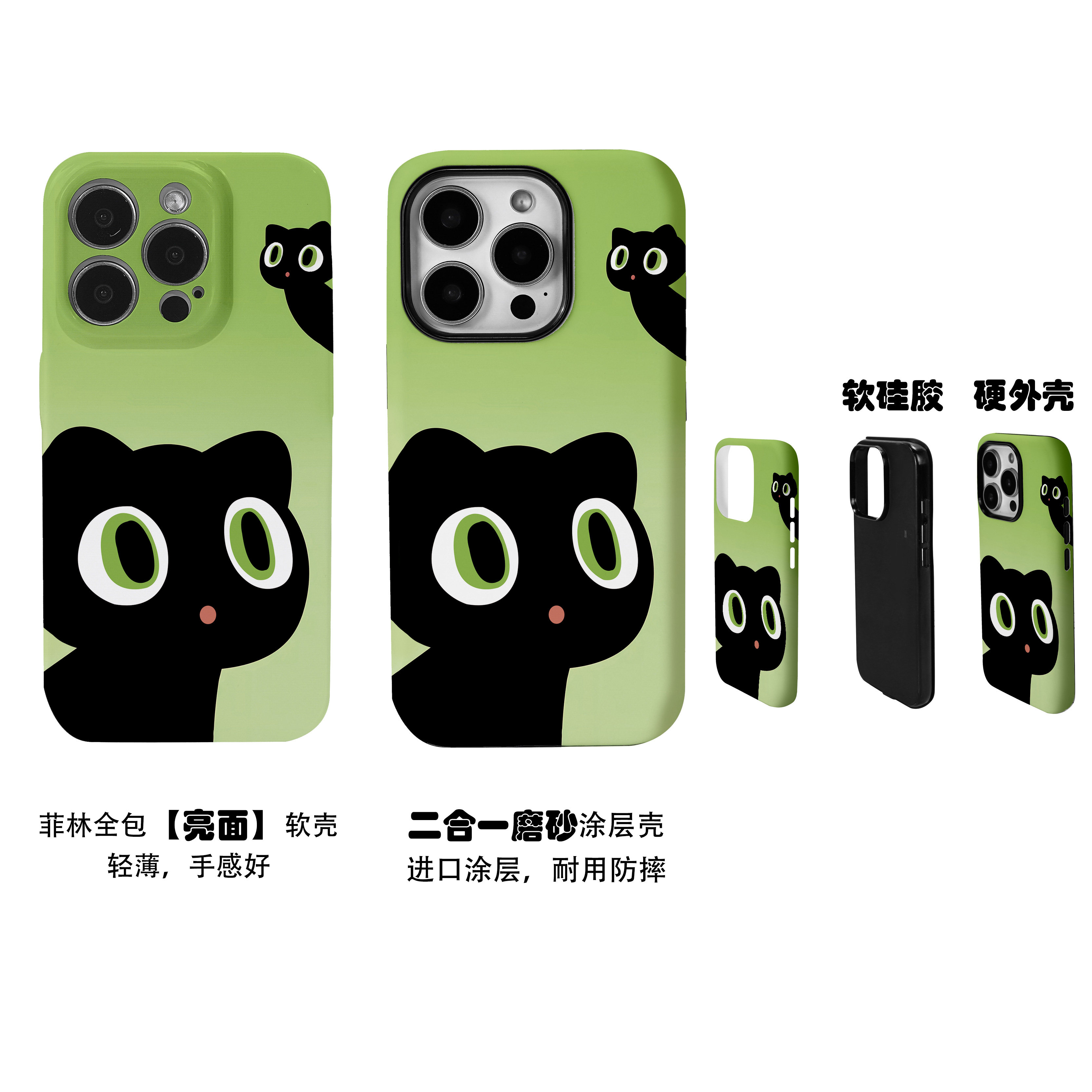 可爱卡通黑色猫咪绿色菲林二合一手机壳适用苹果17nova14华为p70mate60小米15opporen14ovivo荣耀300iPhone16