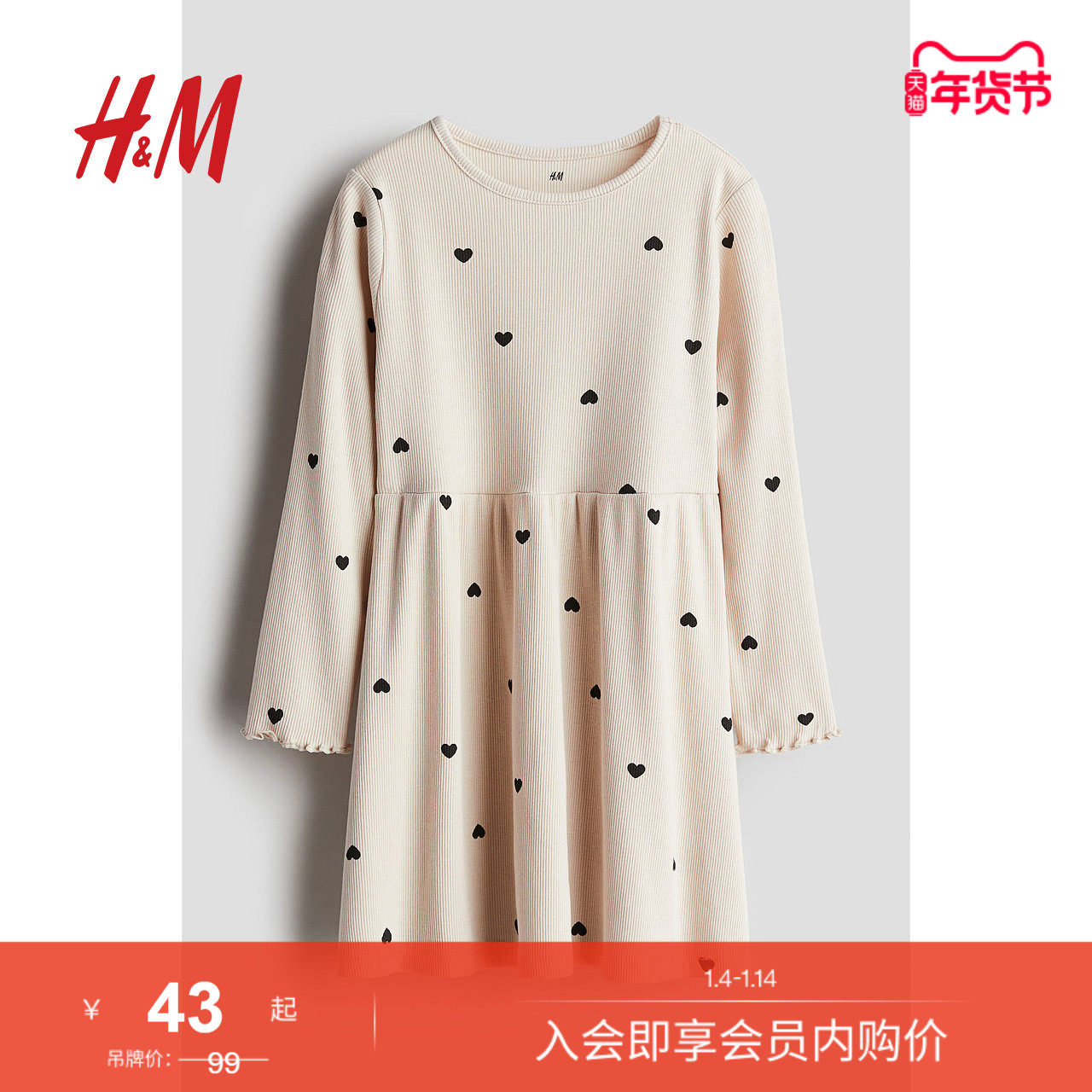 HM童装儿童女童连衣裙冬季时尚简约罗纹休闲公主裙1248317