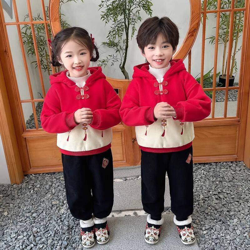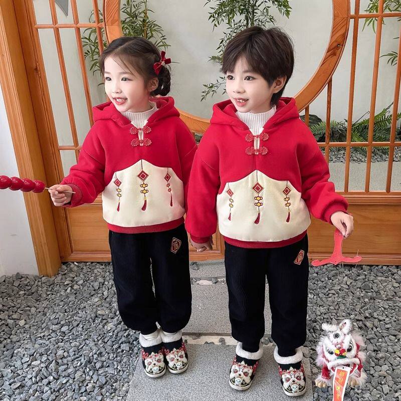 儿童兄妹2026马年国风拜年服冬季加绒加厚男女童套装刺绣唐装上衣