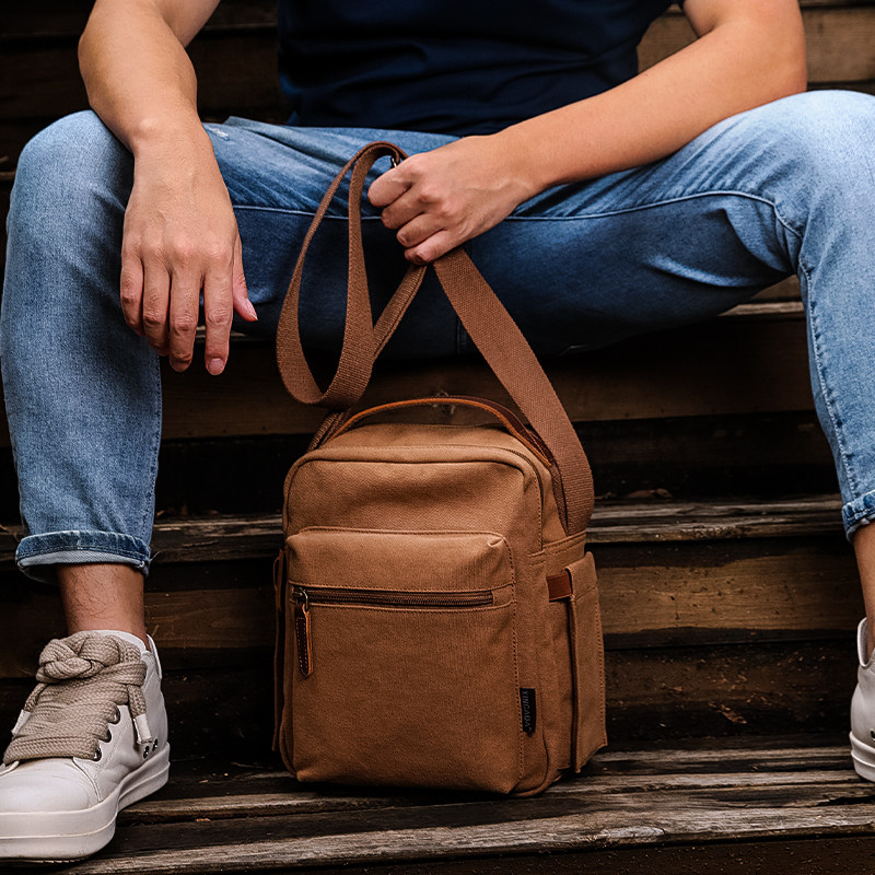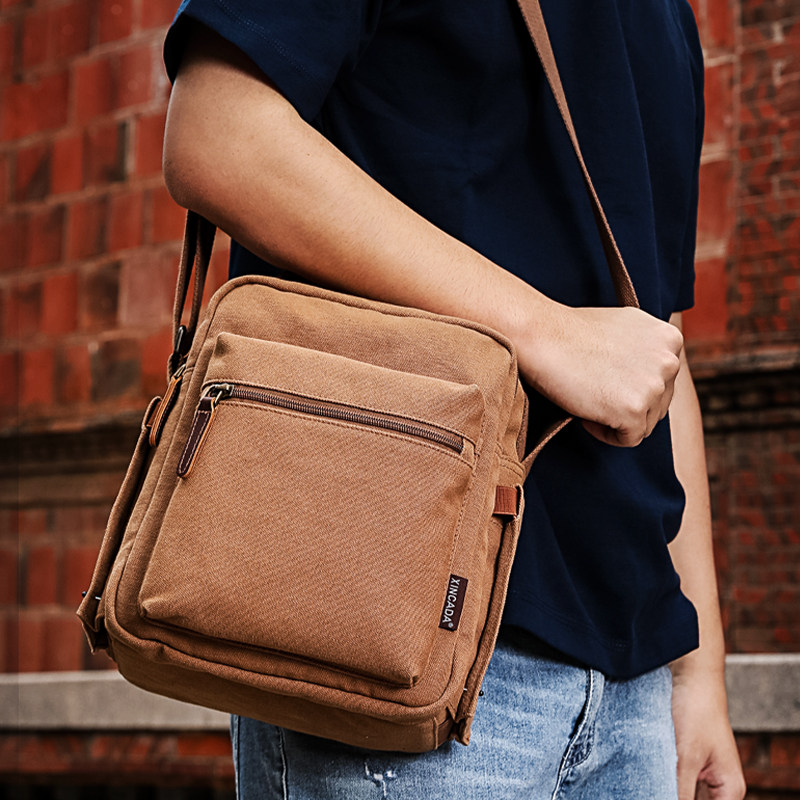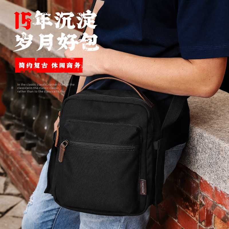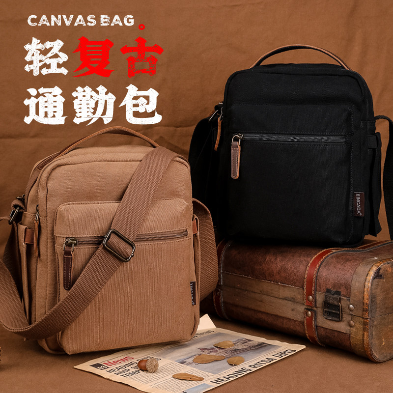 新款复古帆布单肩包男士小背包斜挎商务公文包通勤休闲男包包水杯