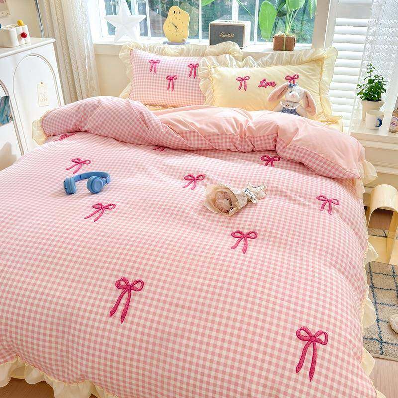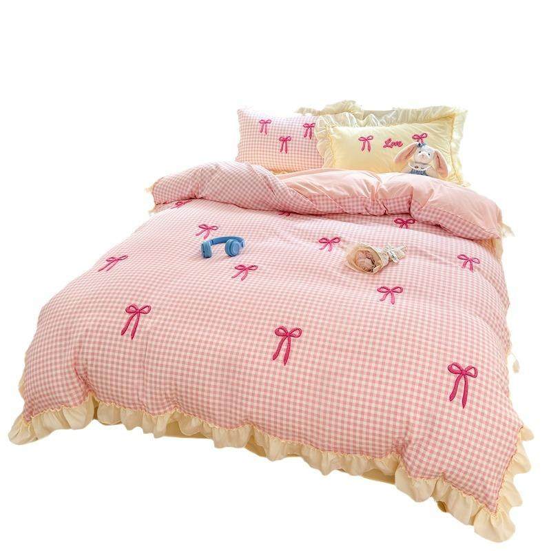 小清新粉蝴蝶结水洗棉毛巾绣床上四件套床单1.2米被套宿舍三件套