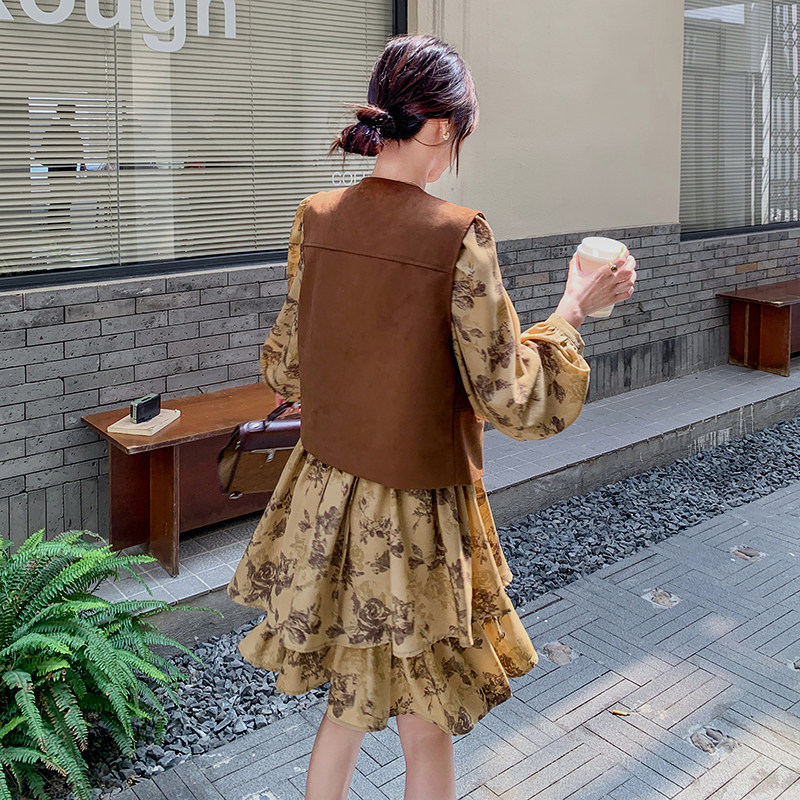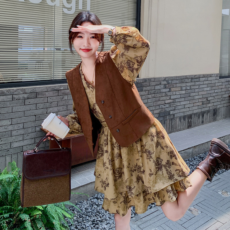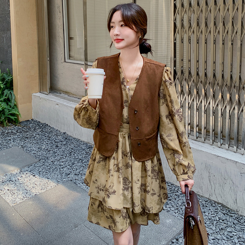one more26年春秋法式复古马甲碎花连衣裙套装女显瘦气质两件套
