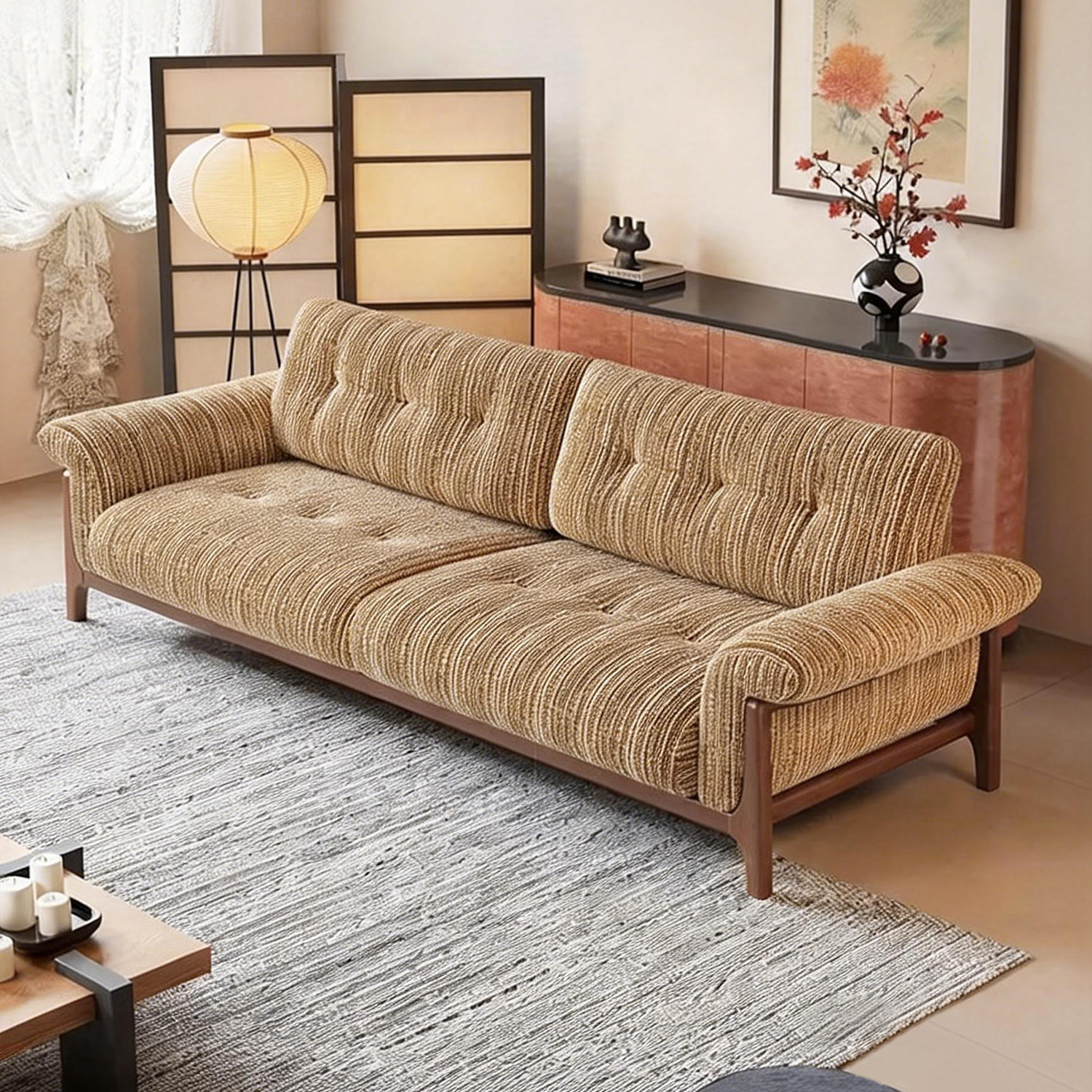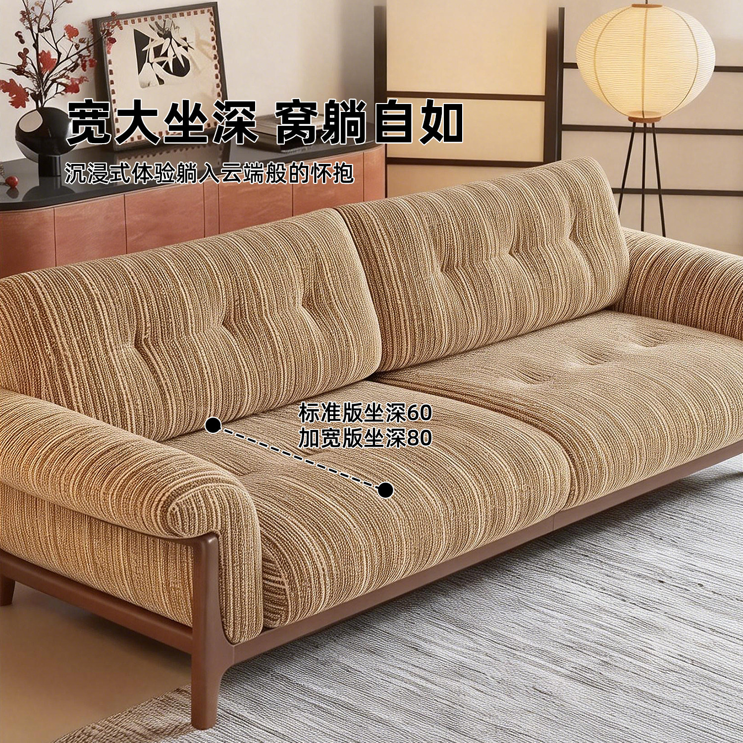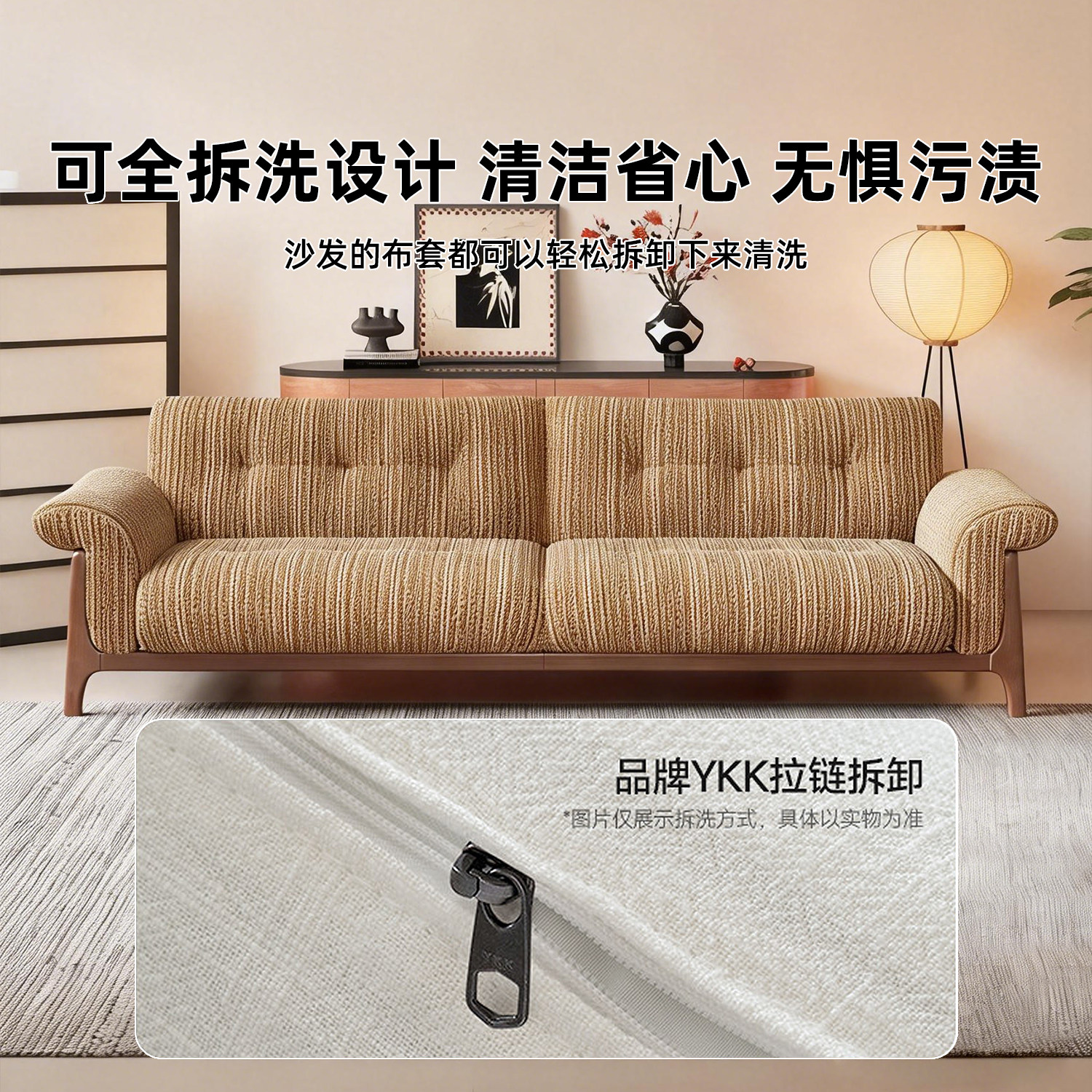 上进布艺可全拆洗中古胡桃木亚棉麻条纹实木布艺沙发双人小户型