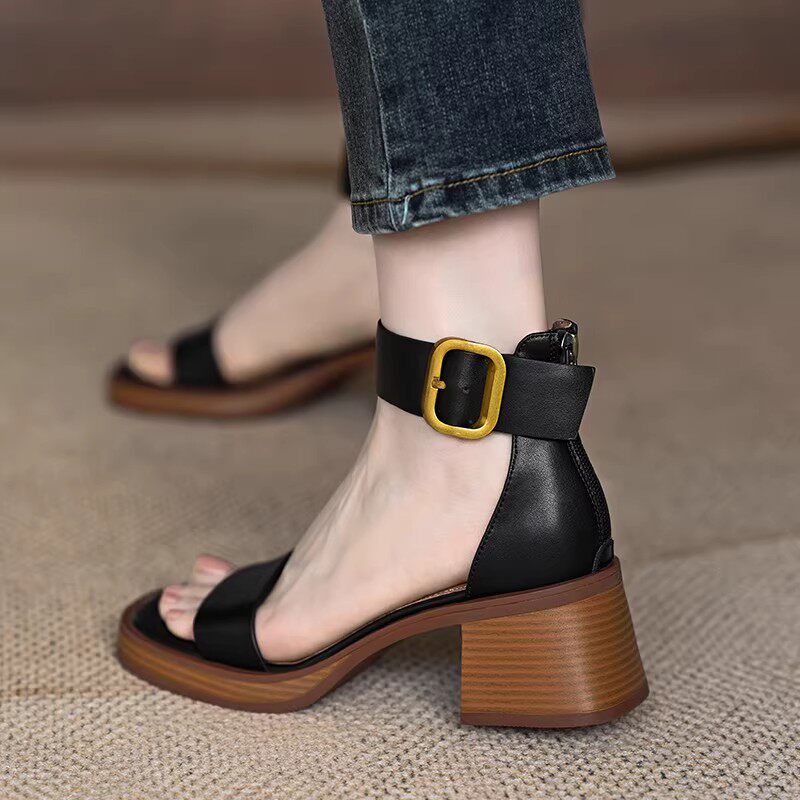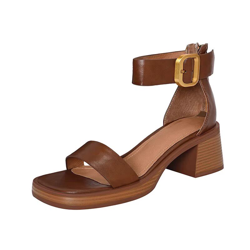 真皮~骄屿棕色带罗马凉鞋2025新款粗跟复古风配裙子绝美夹趾凉鞋