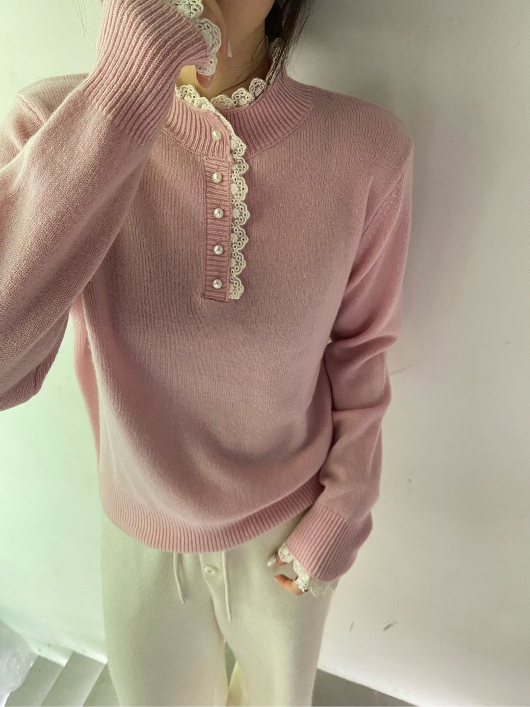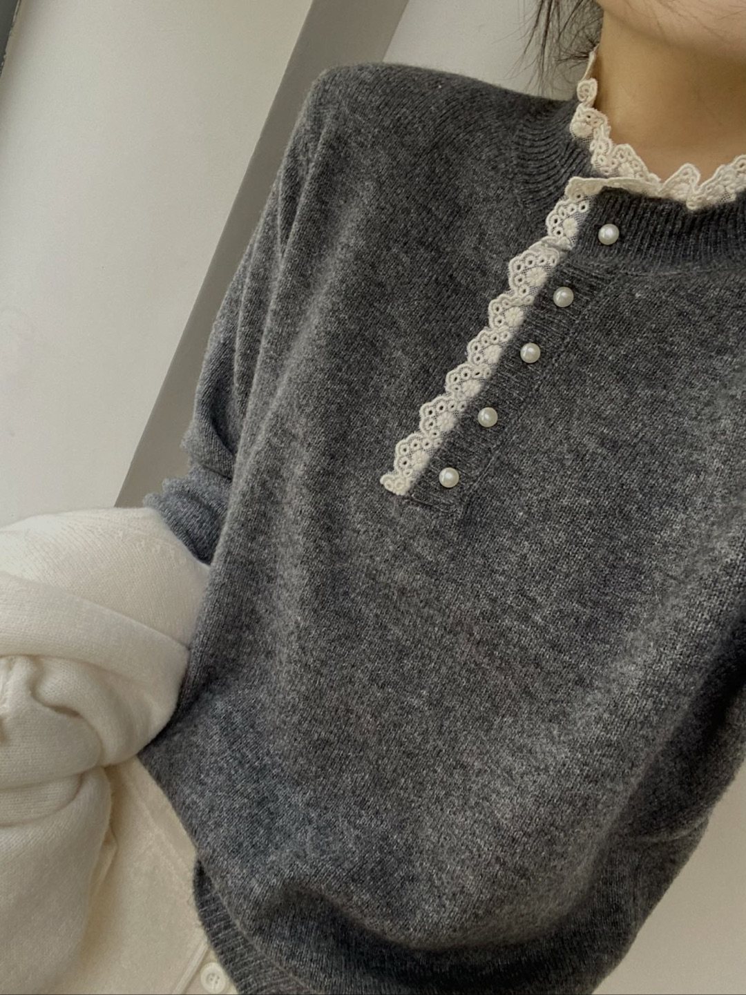 全羊毛拼接花边蕾丝领针织打底衫女2025新款内搭洋气女装秋冬毛衣