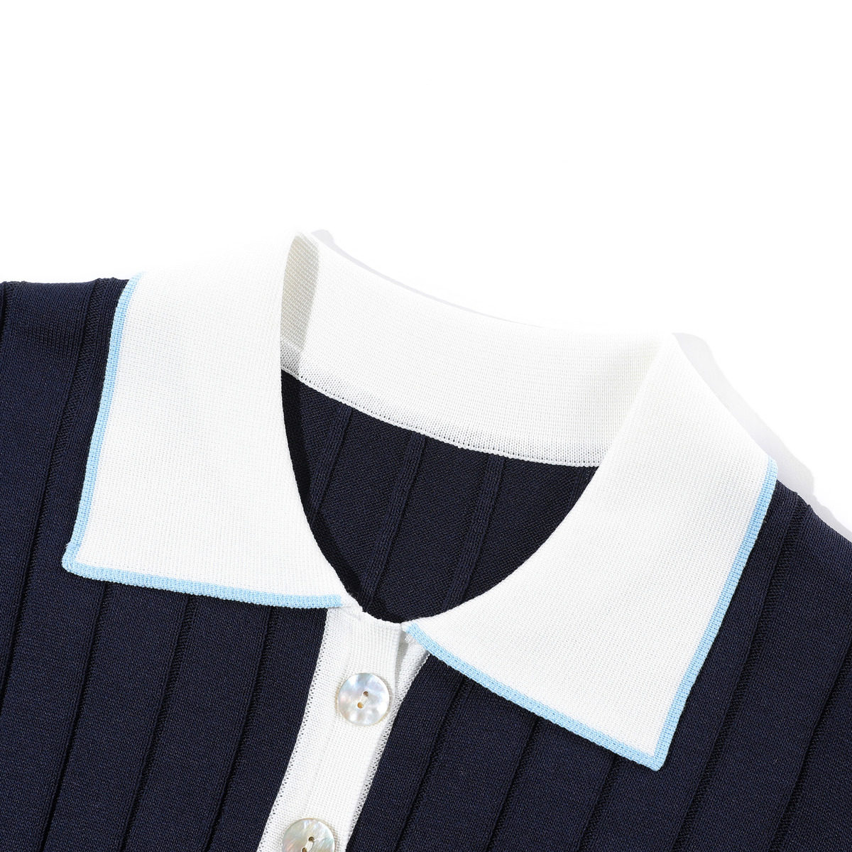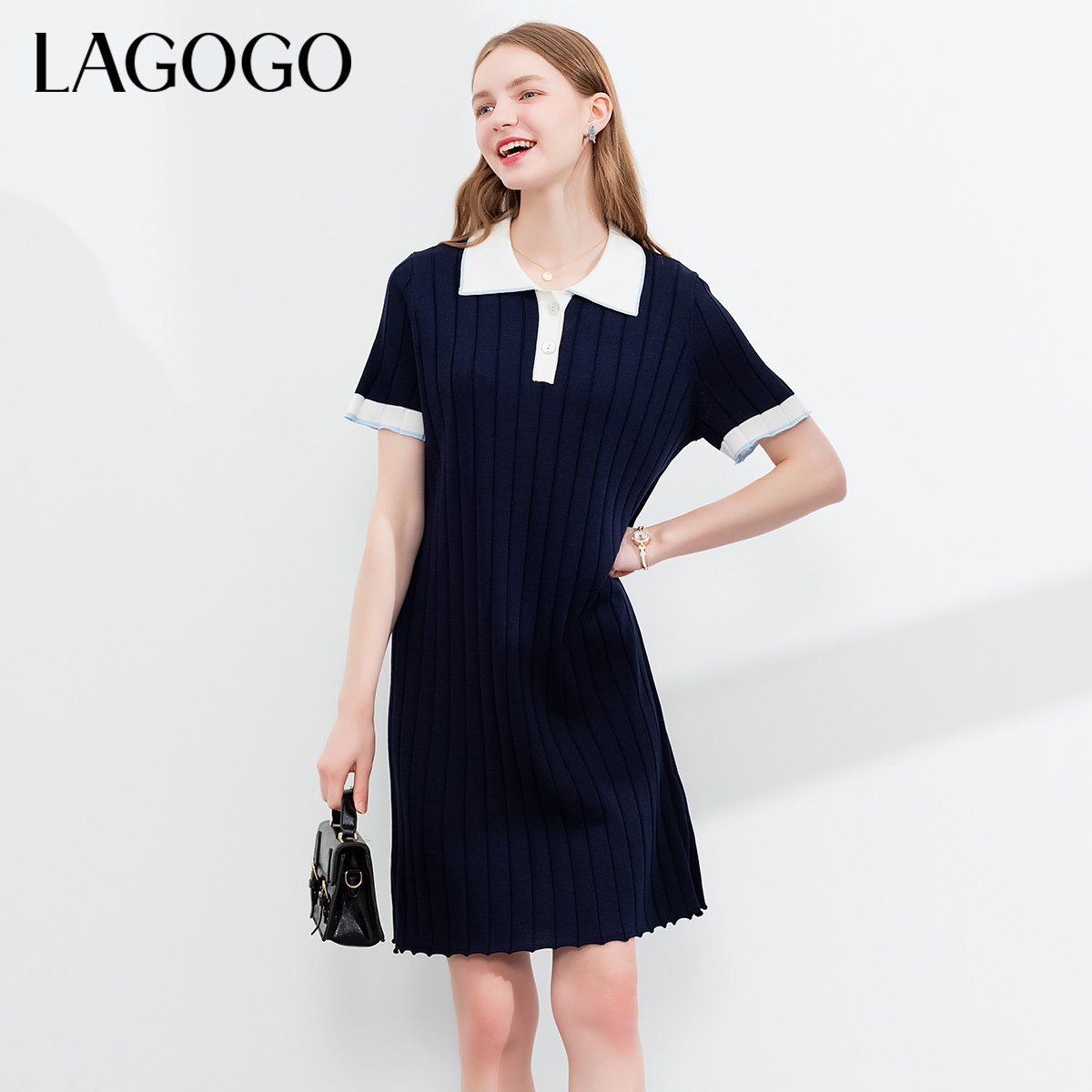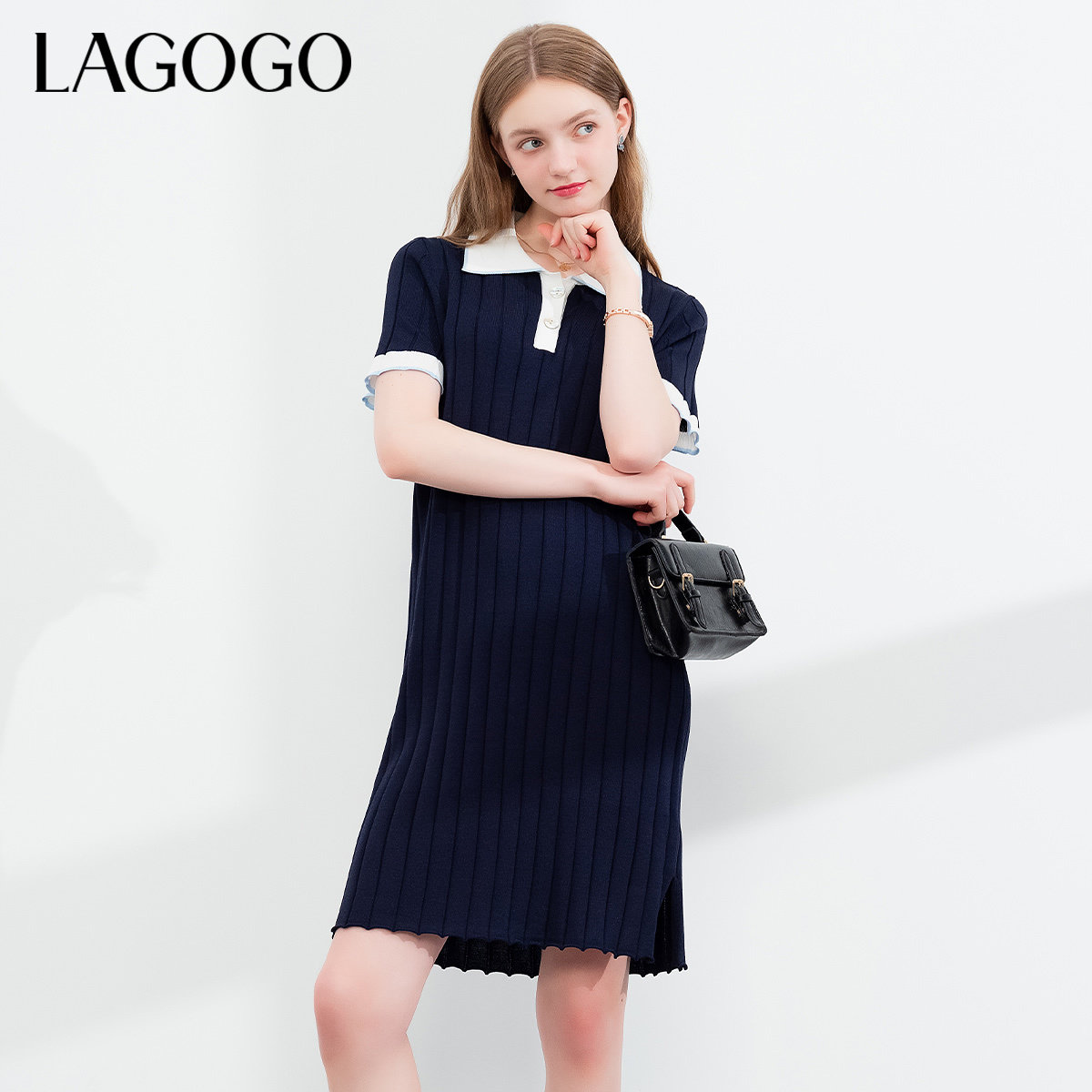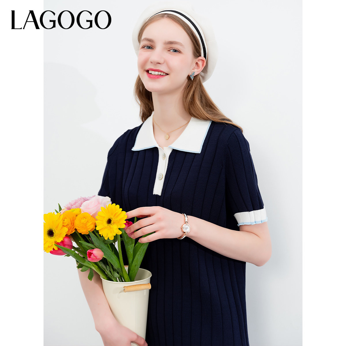 LAGOGO藏青色polo衫针织连衣裙女拉谷谷夏季新款撞色短袖中长裙
