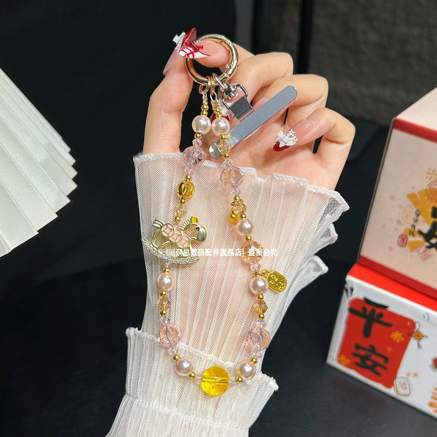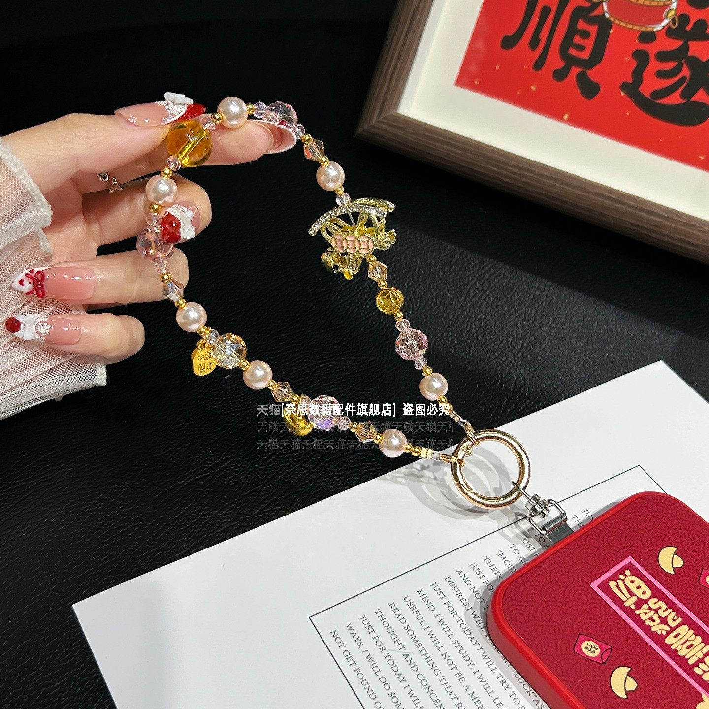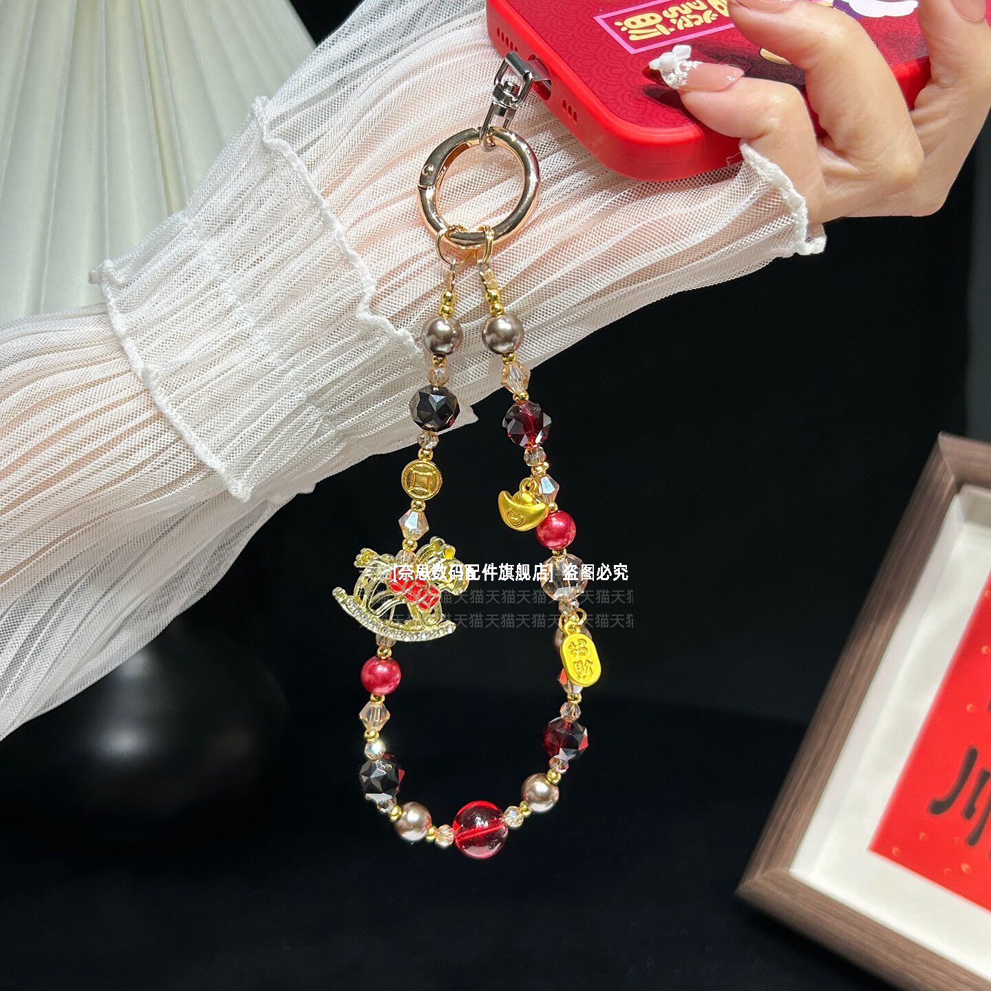 招财小马手机链串珠挂饰精致元宝吊坠挂链马年聚财好运红色链条挂手腕时尚精致水晶中式手链珍珠腕带女垫片壳