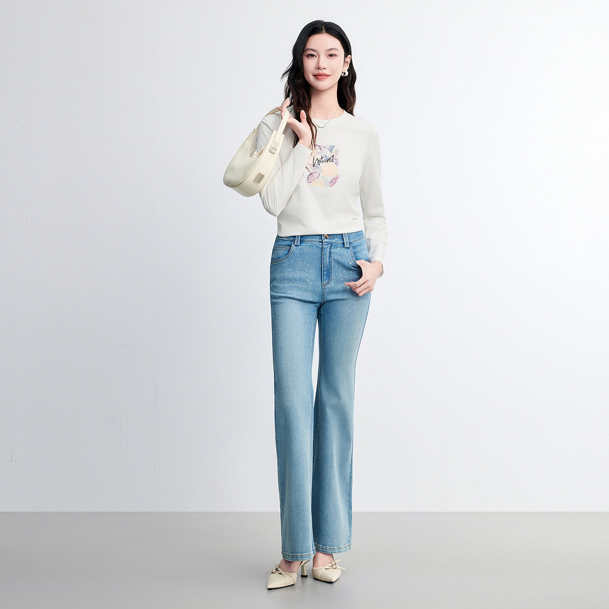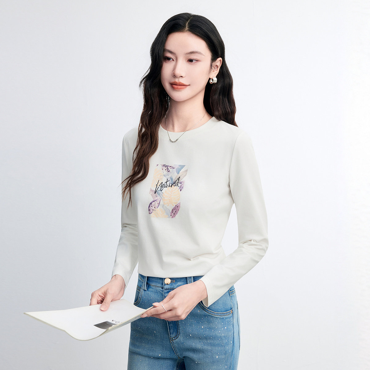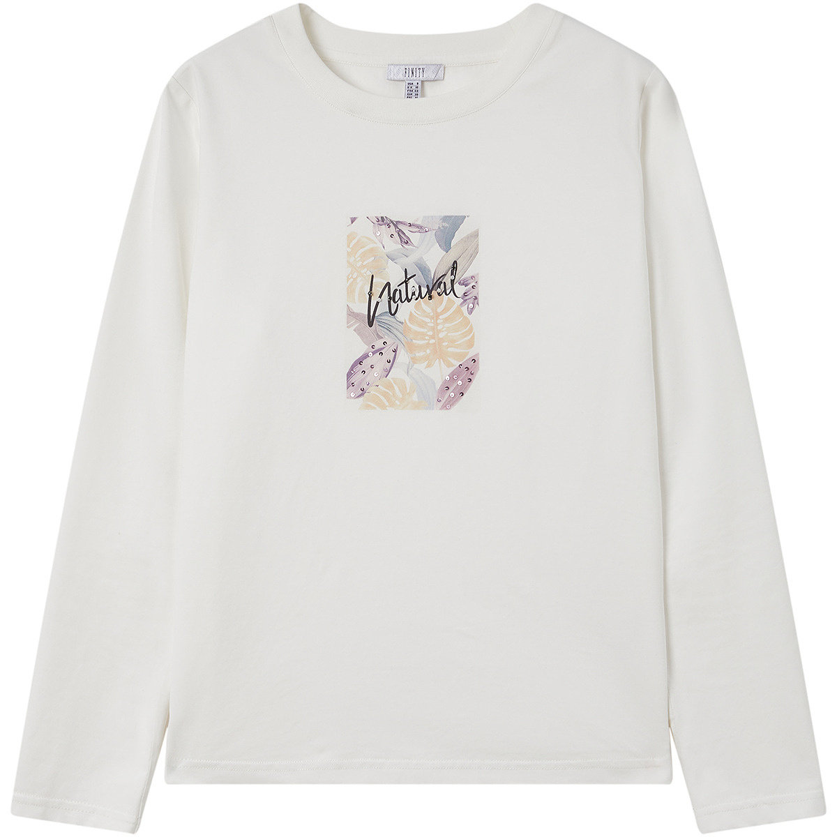 FINITY菲妮迪T恤2026春新款简约字母印花白色长袖内搭套头上衣女