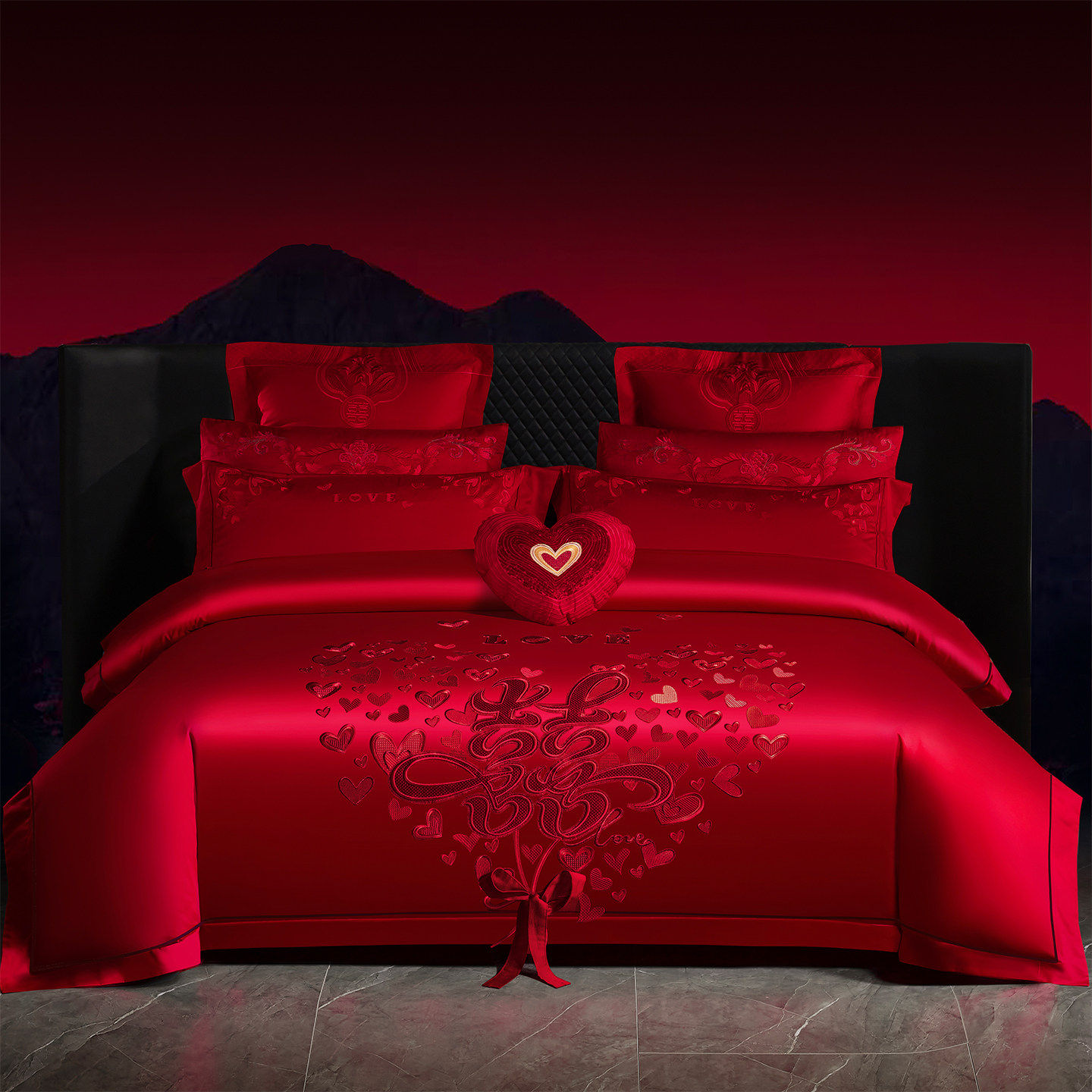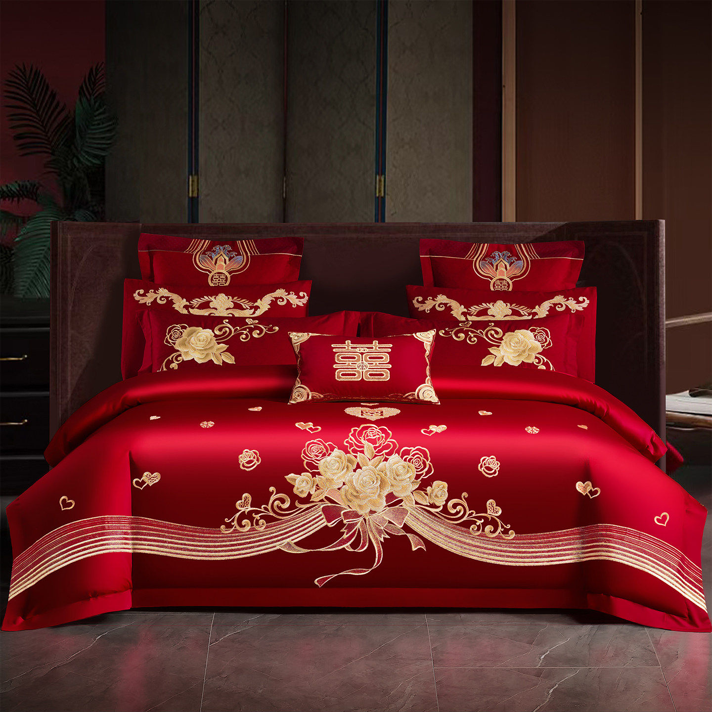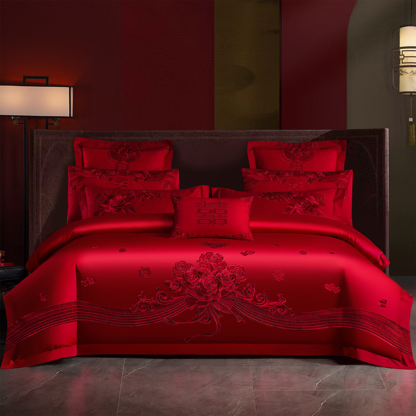 法式浪漫婚礼床上用品100支长绒棉刺绣花红色婚庆被套床单四件套