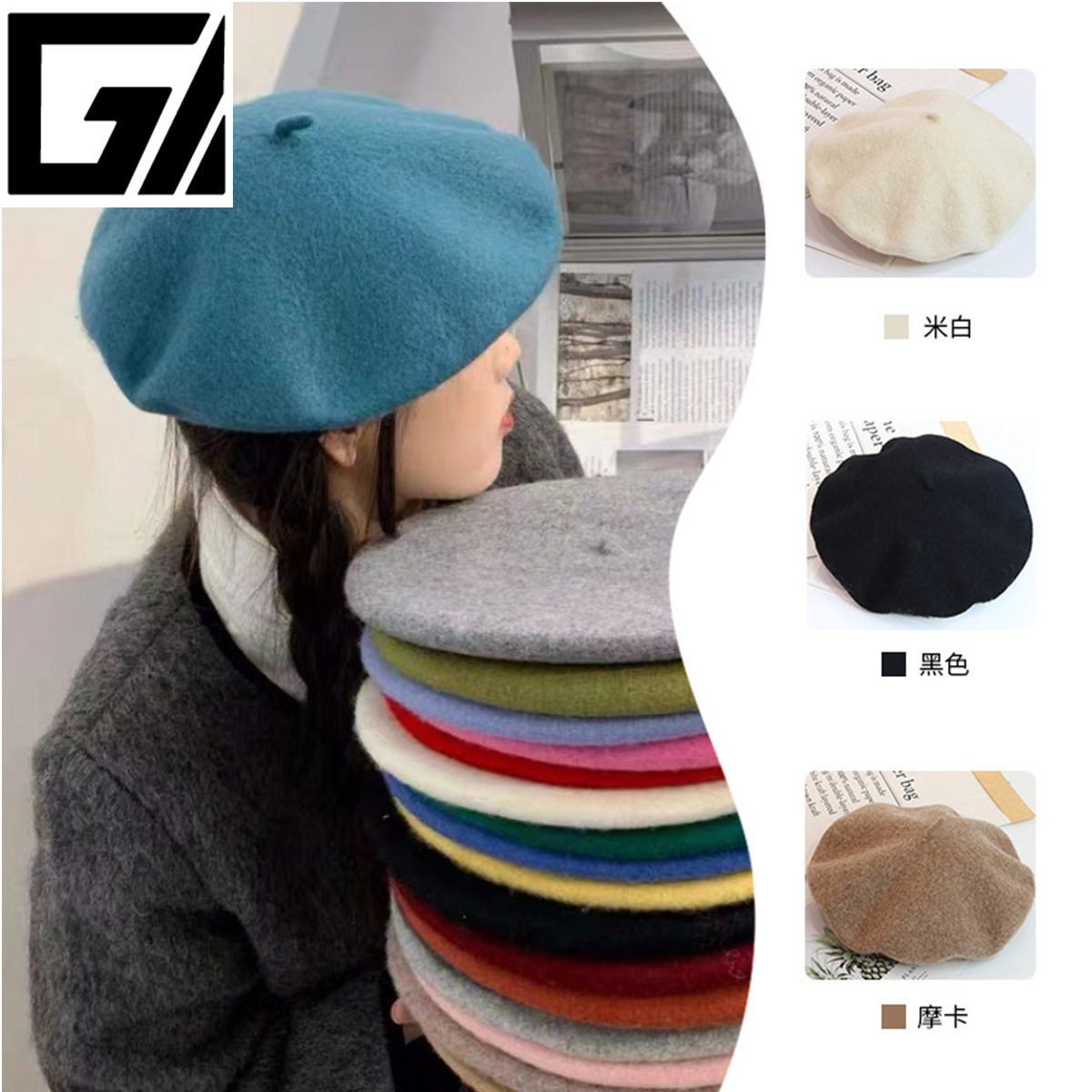 2024新款秋冬纯色羊毛贝雷帽大头围男女同款画家帽百搭毛呢帽子女
