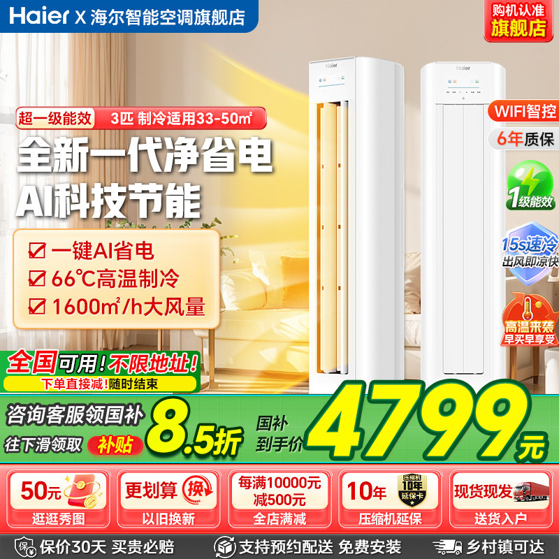 政府补贴20%海尔立式空调净省电3匹2匹柜机一级家用客厅冷暖空调