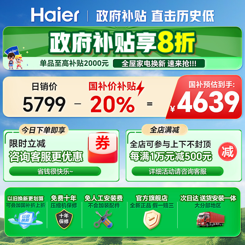 [国补20%]海尔空调1.5匹家用一级能效变频冷暖卧室统帅挂机节能