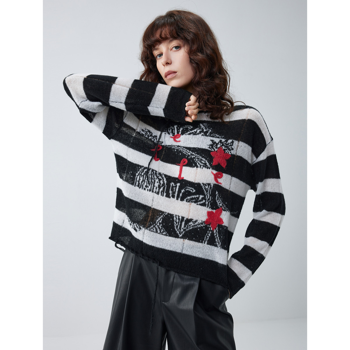 ELLE绵羊毛提花条纹针织衫女2025秋季新款马海毛圆领慵懒感毛衣