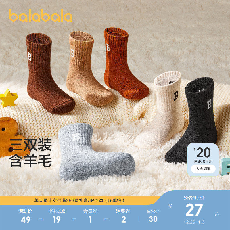 巴拉巴拉儿童保暖袜子冬季舒适男童女童羊毛袜亲子学生百搭三双装
