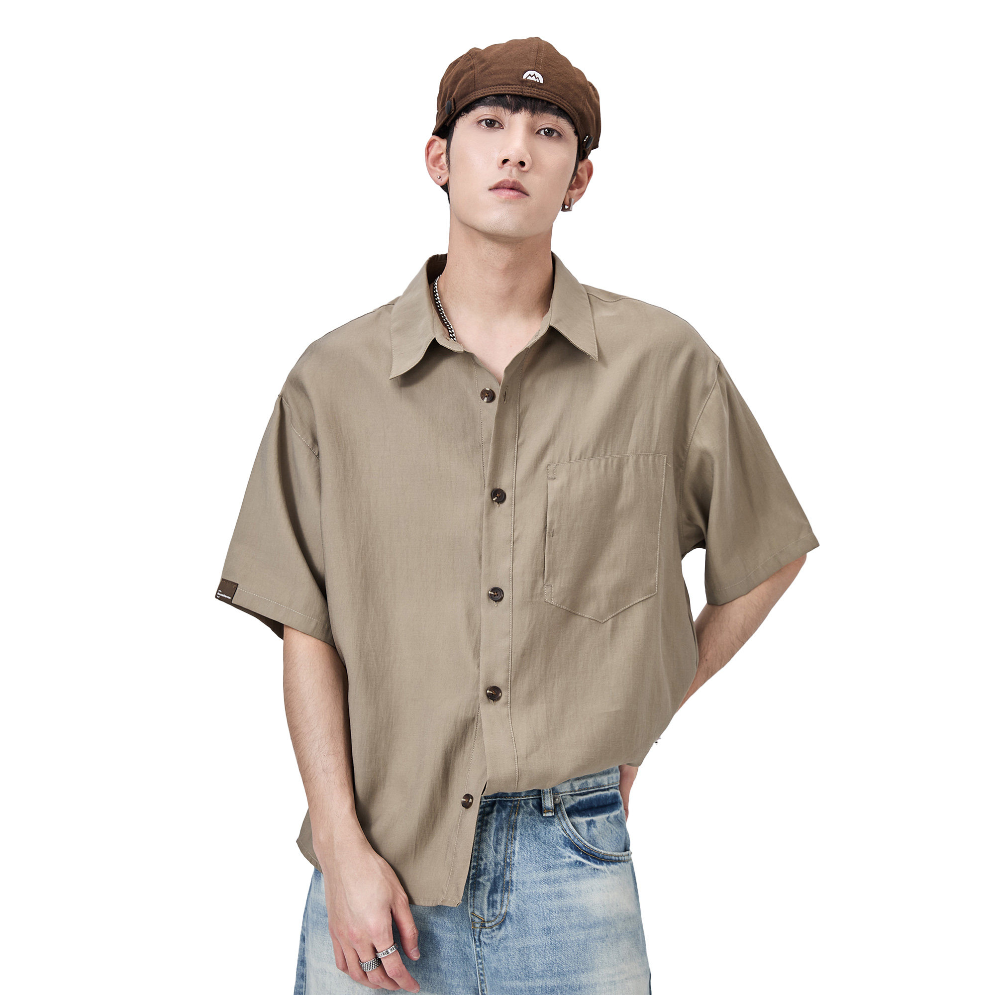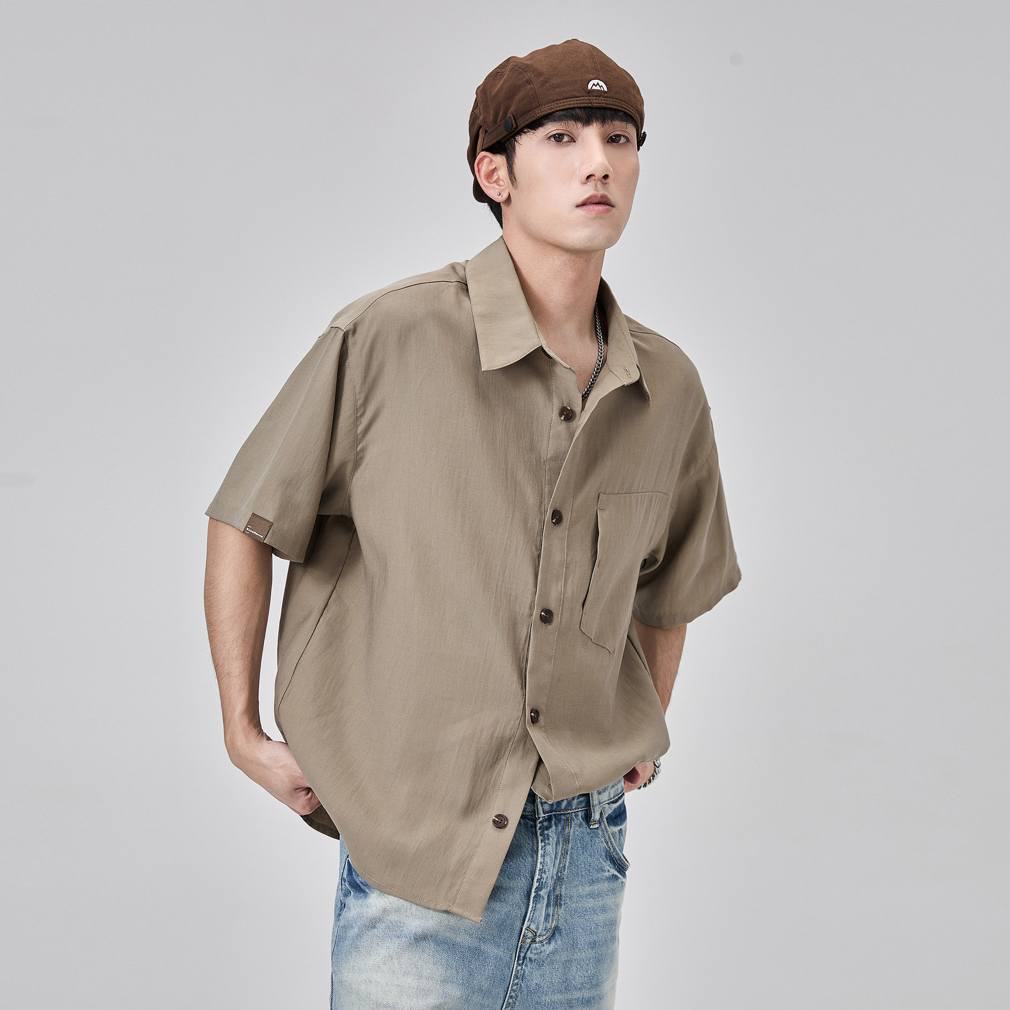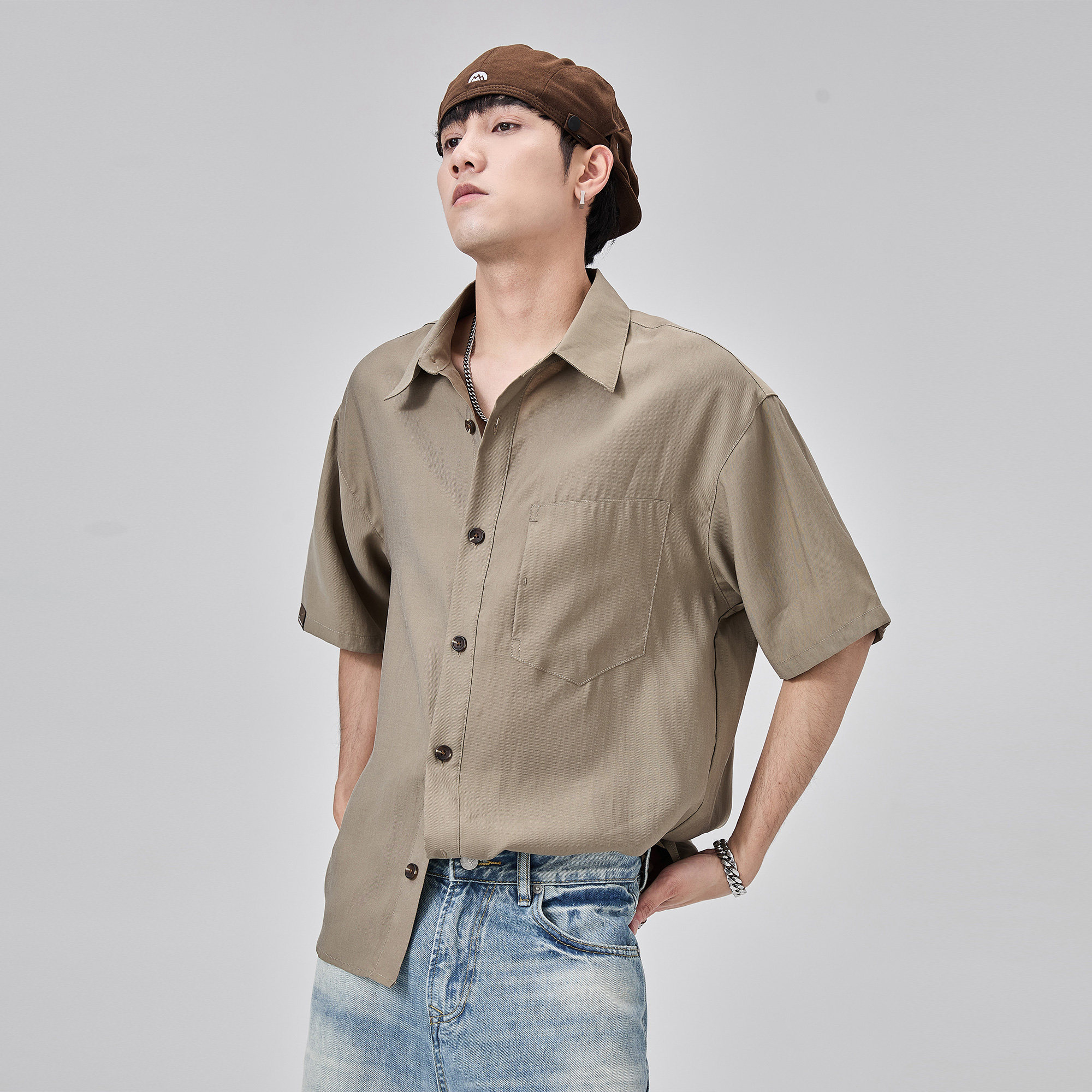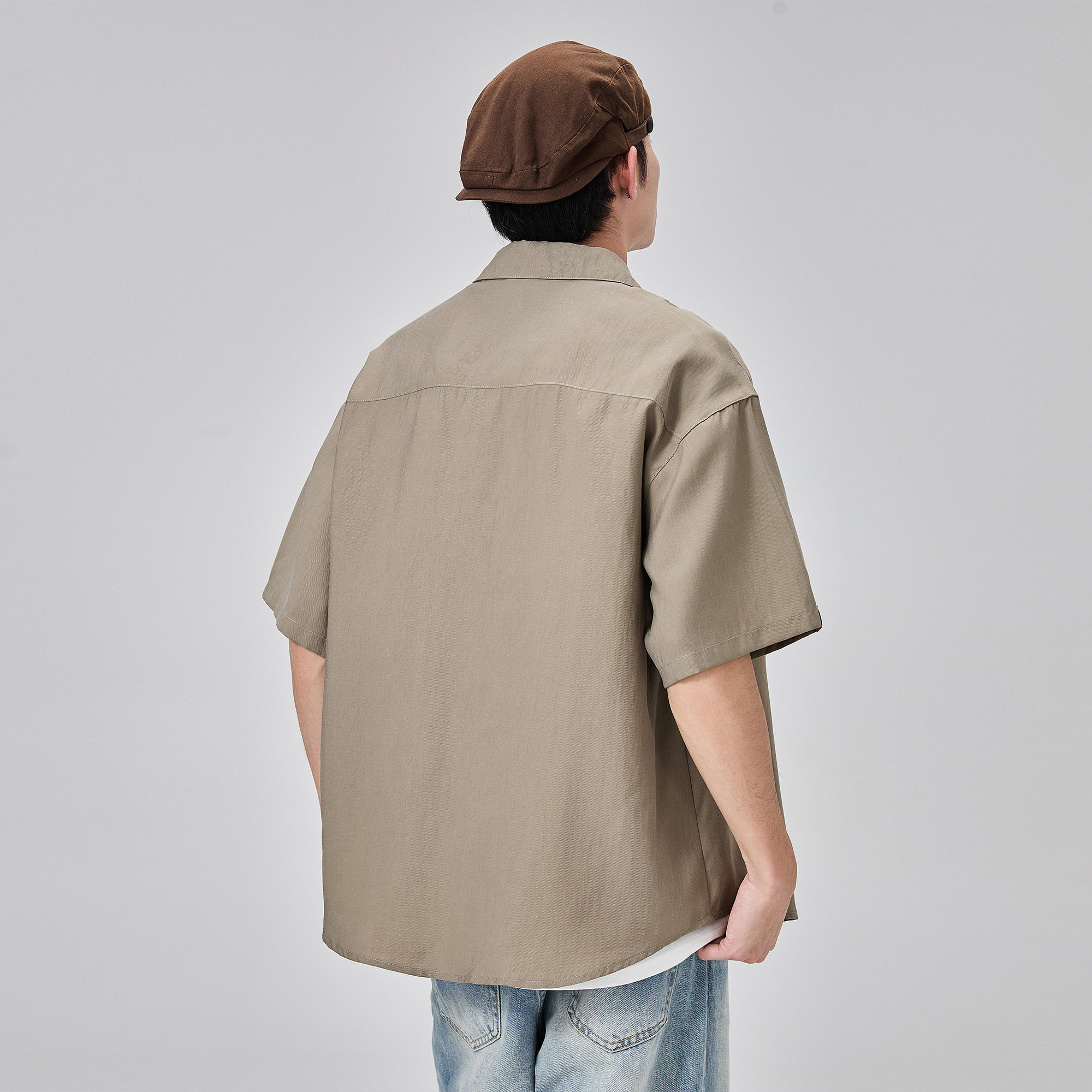 ALLIN 美式重磅短袖衬衫男夏季纯色翻领口袋休闲上衣半袖宽松衬衣