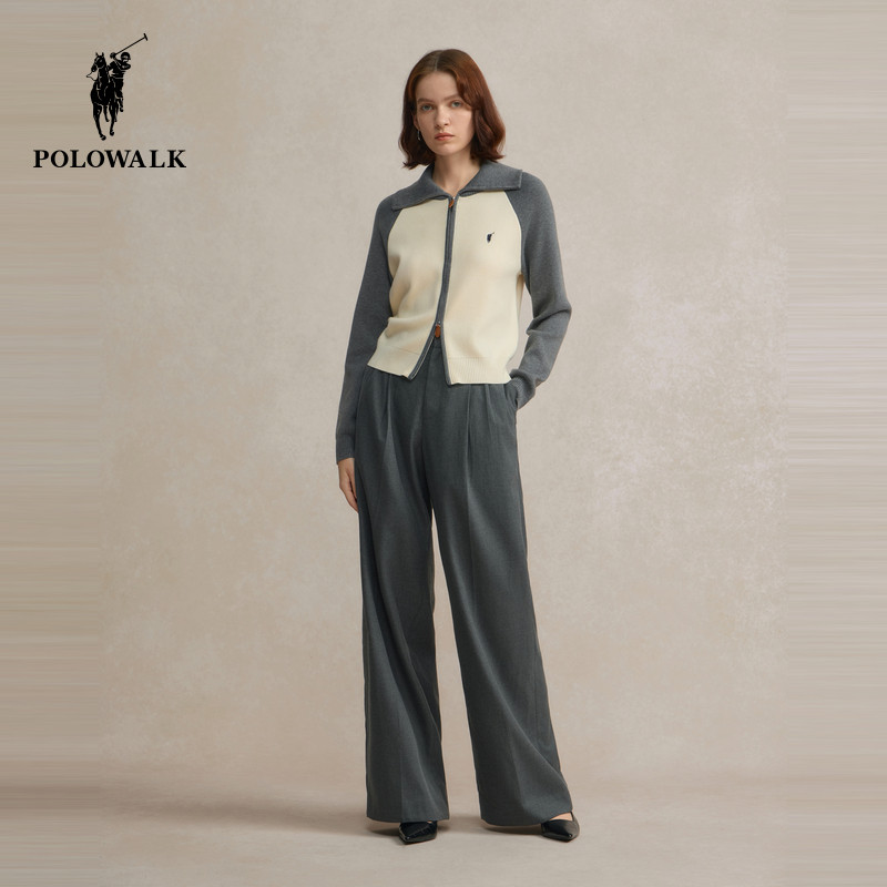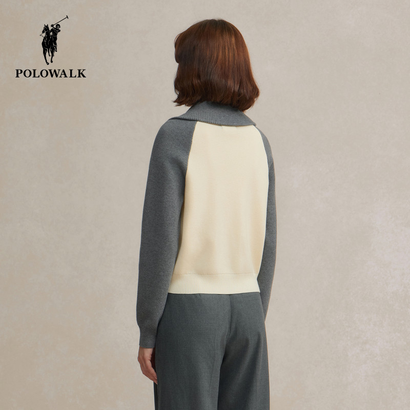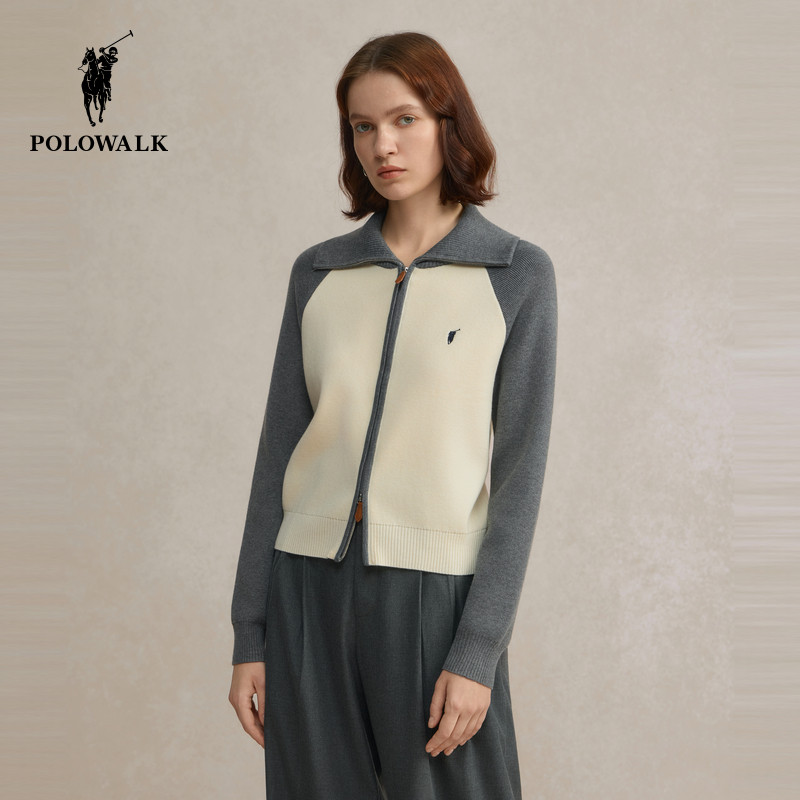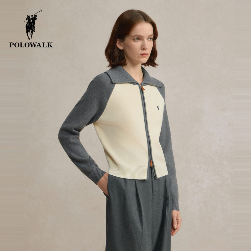 POLOWALK长袖翻领针织衫女式2025秋季新品撞色拉链开衫显瘦上衣女