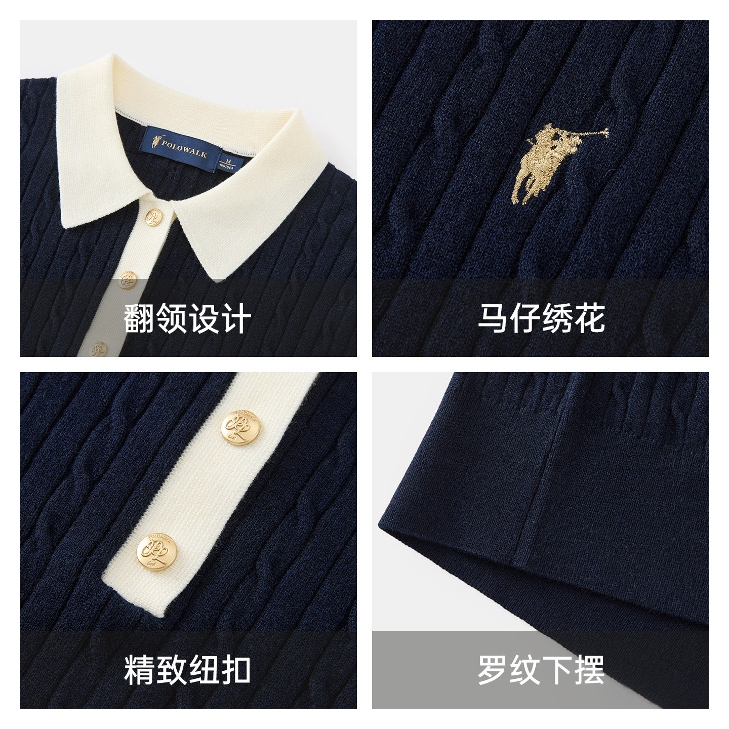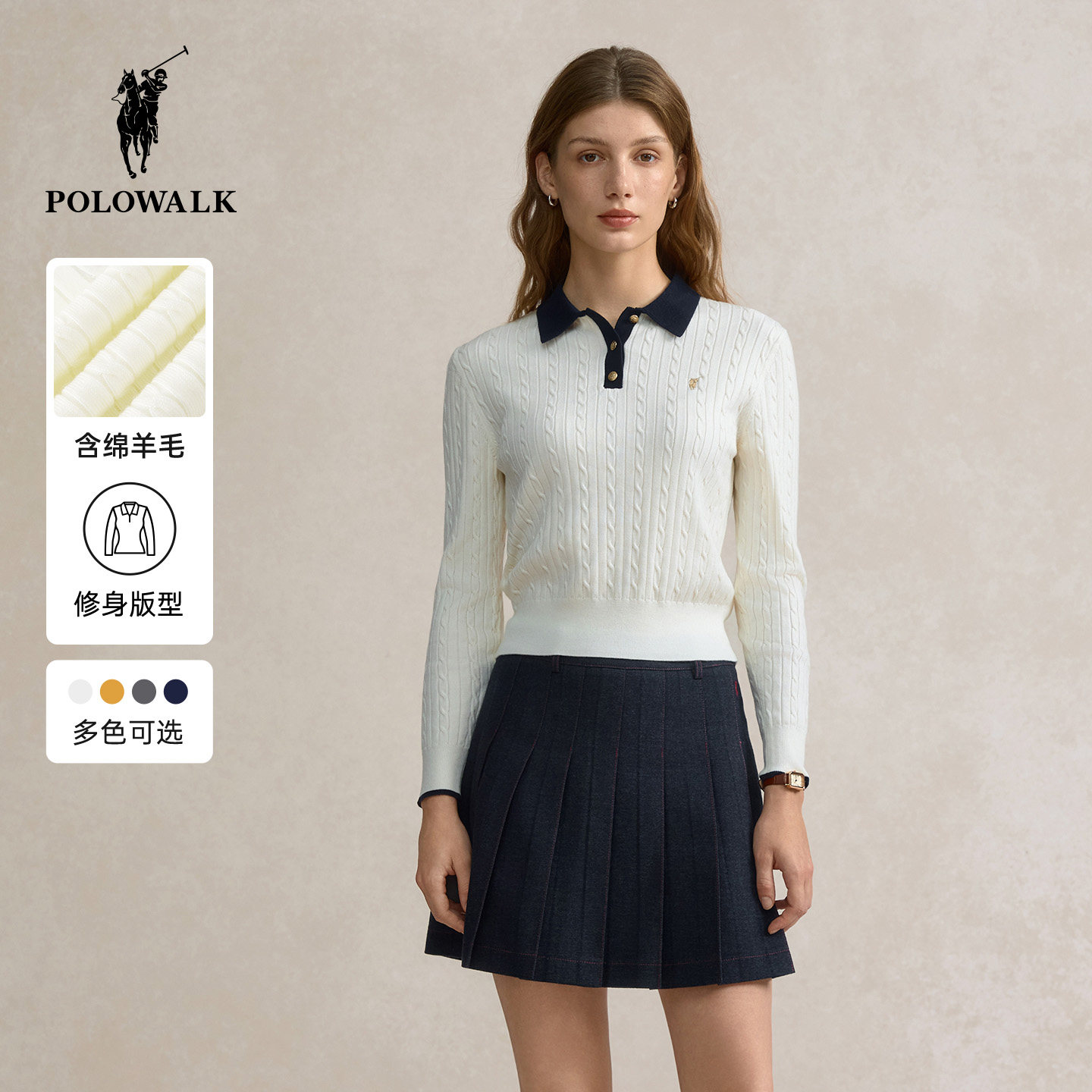 POLOWALK女士长袖针织衫2026春季新款绞花撞色打底衫休闲套头毛衣