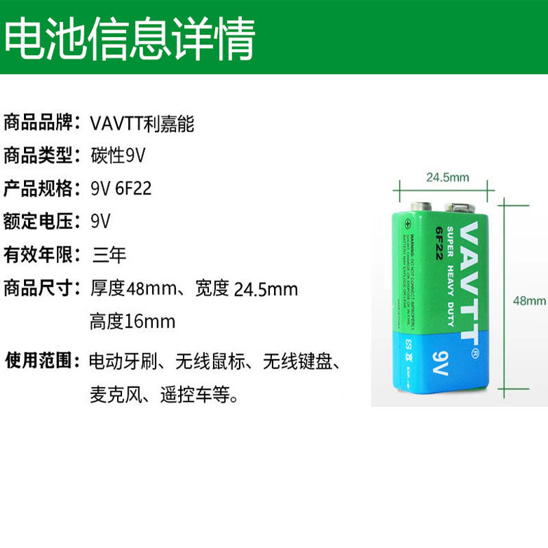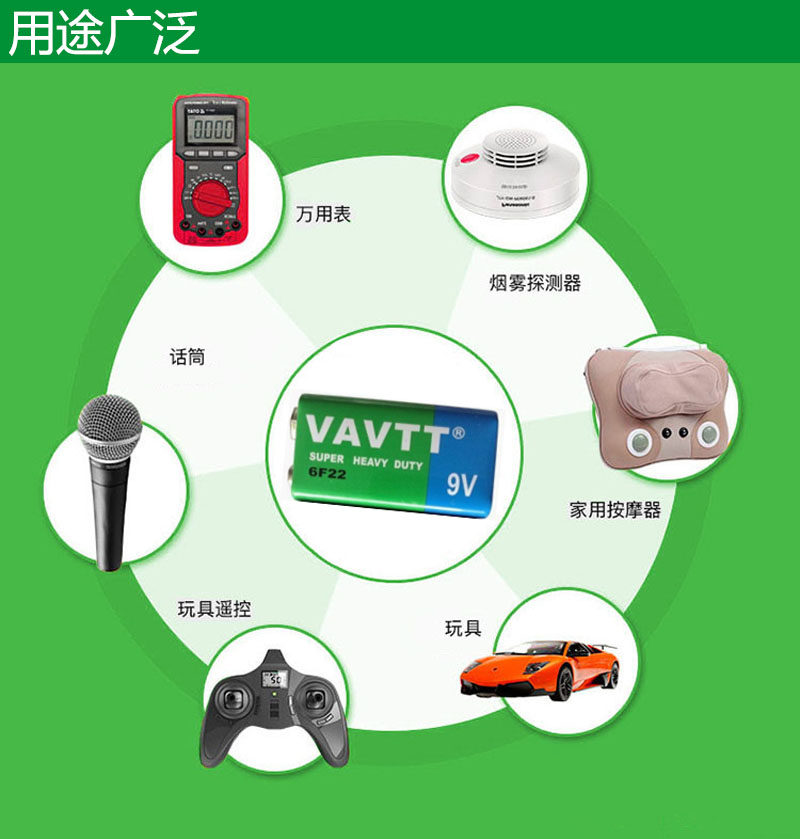 VAVTT 9V方块电池碳性叠层6F22报警器遥控红外万用表话筒玩具包邮