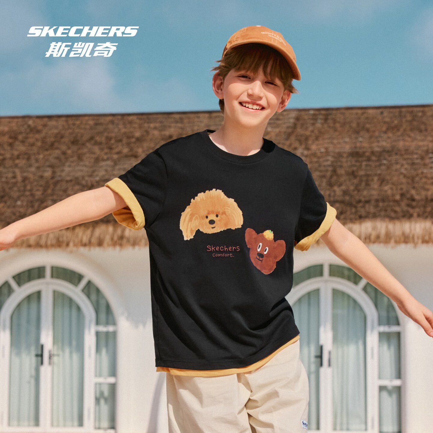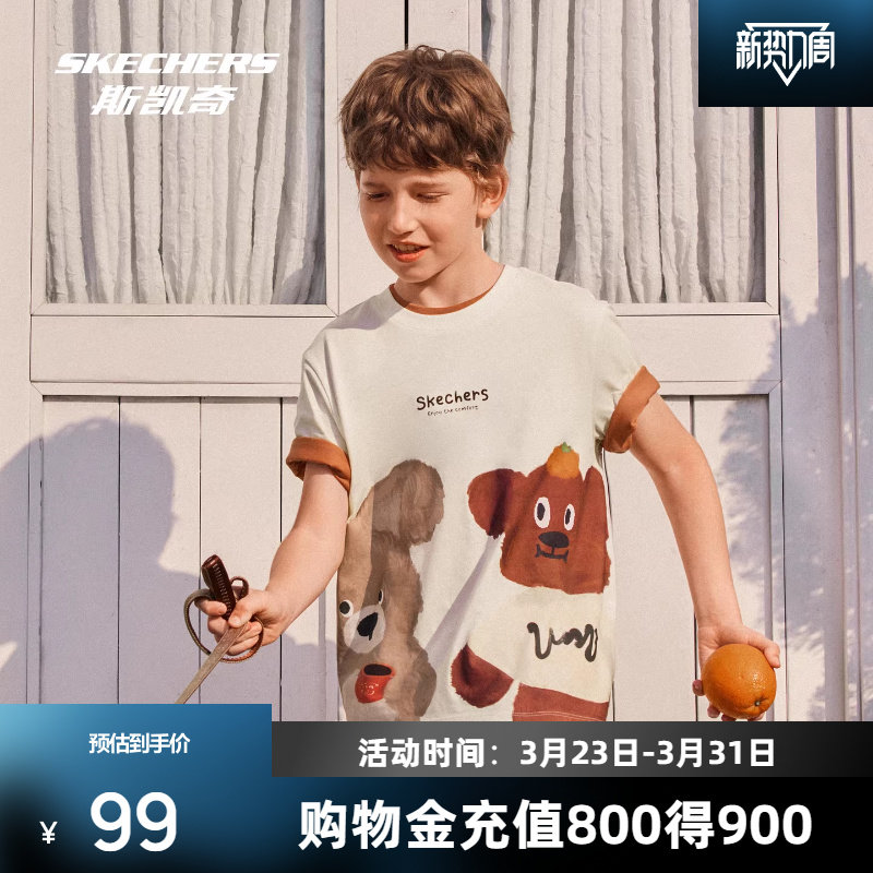 Skechers斯凯奇童装儿童卡皮巴拉贴贴纯棉T恤男女童舒适短袖上衣