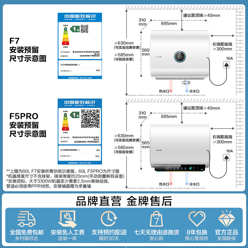 【国家补贴】海尔出品统帅电热水器60L家用一级扁桶小音浪F7