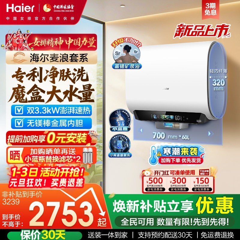 海尔麦浪电热水器官方家用无镁棒小蓝瓶双胆变频速热节能BK5plus