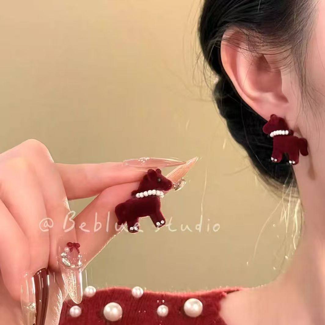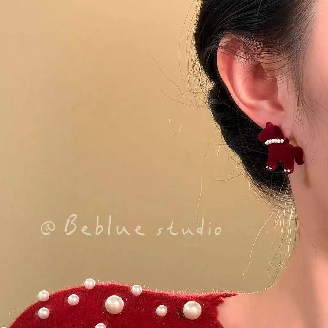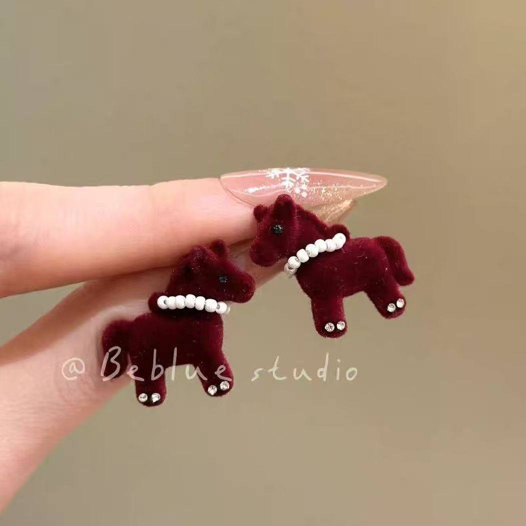 马上来财~复古红色小马耳钉女款独特设计感秋冬绝美耳环耳饰