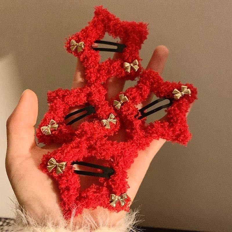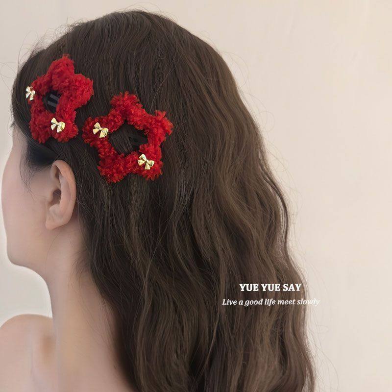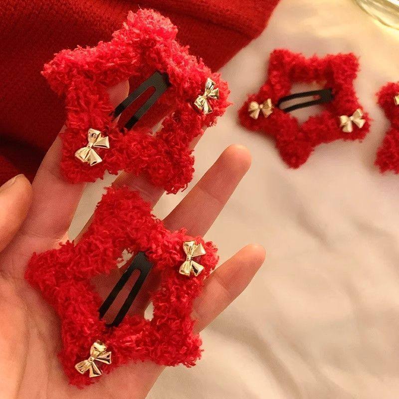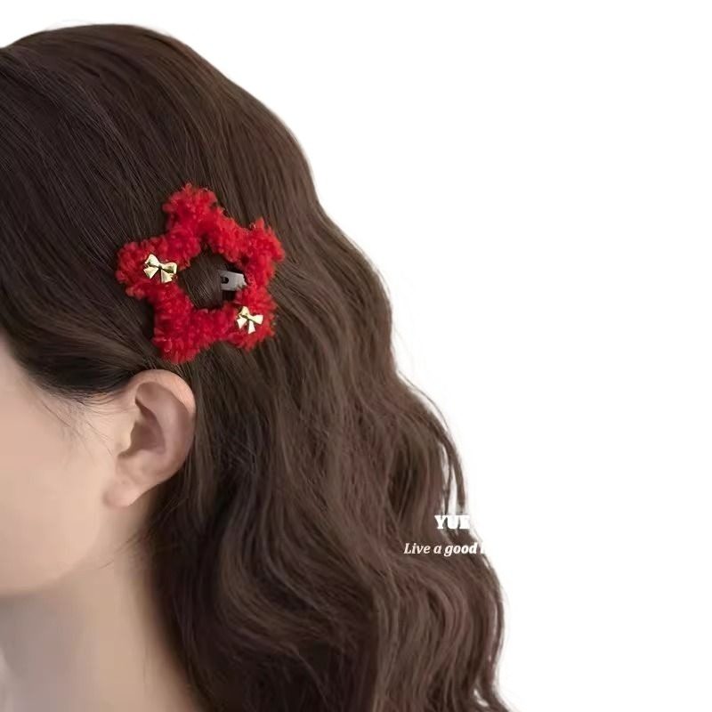 冬季新款红色毛绒发夹小香风蝴蝶结侧边刘海夹圣诞发饰新年头饰女
