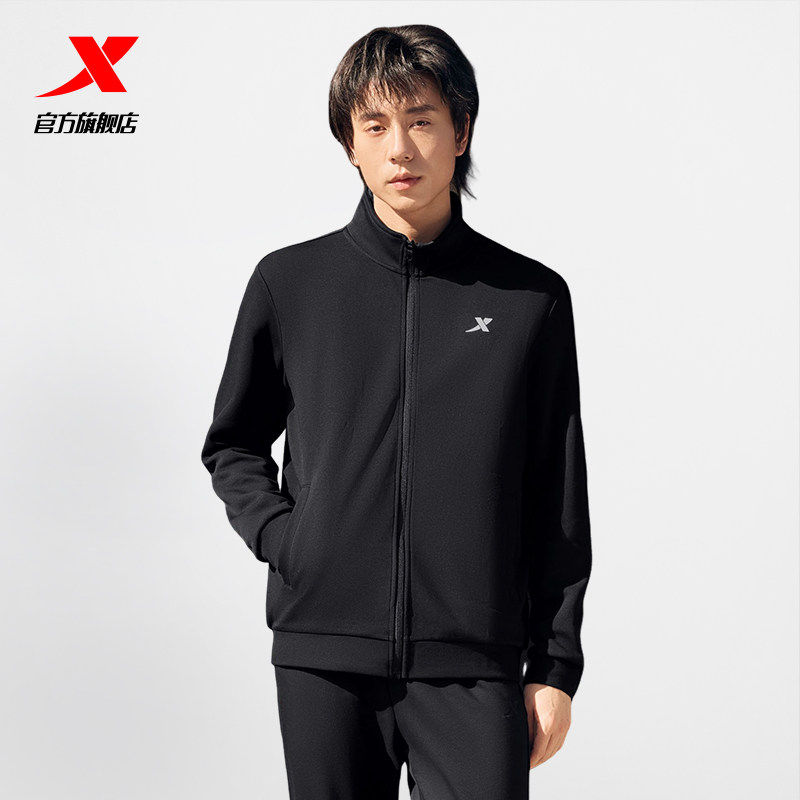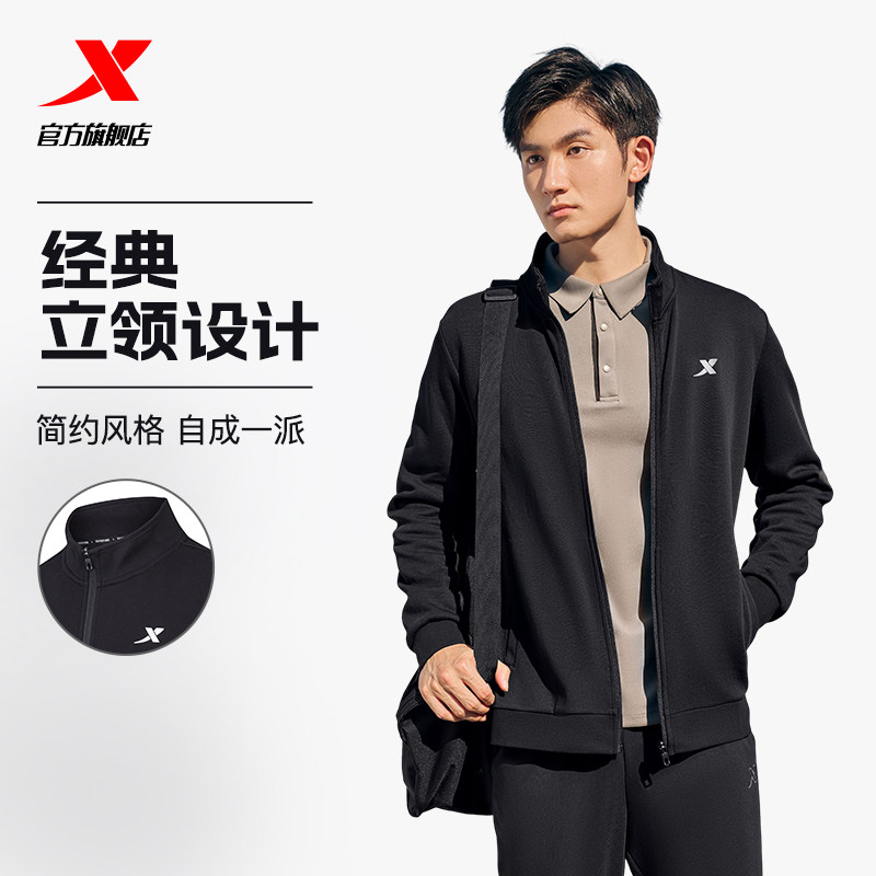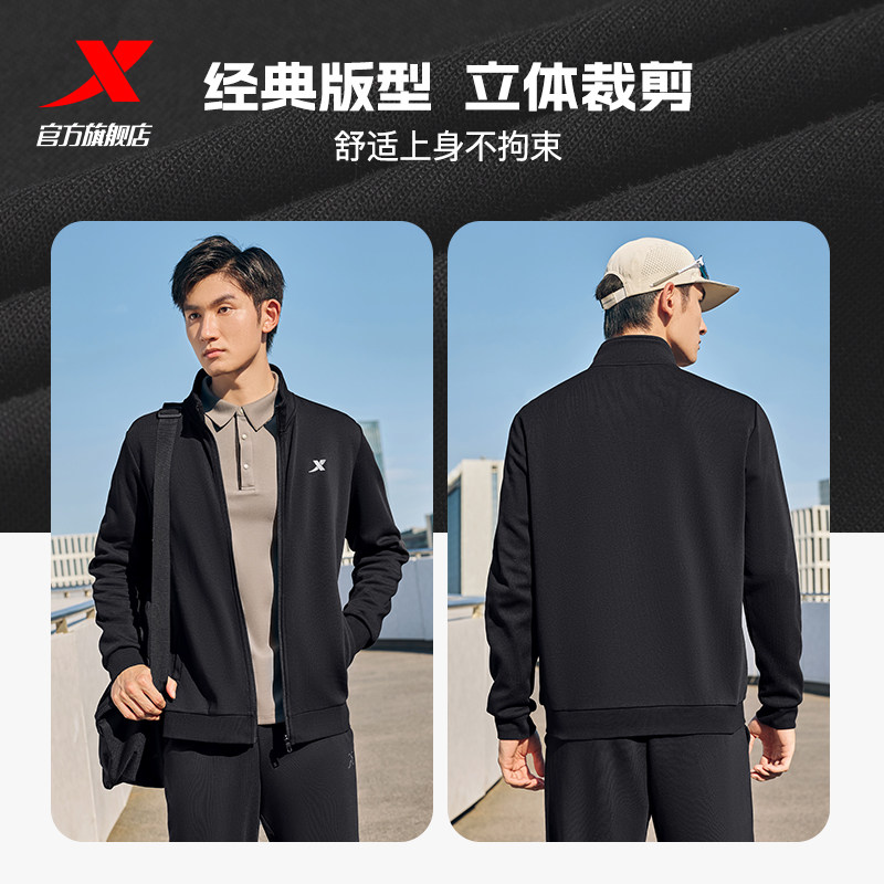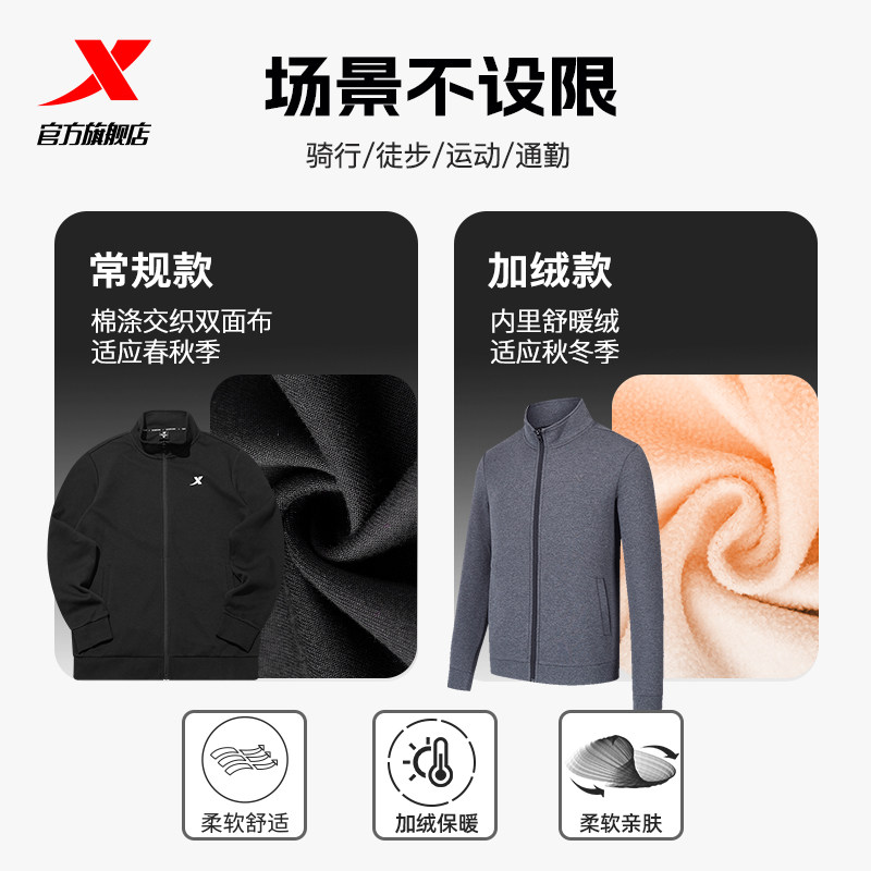 特步加绒外套男款秋冬新款官方运动上衣休闲立领爸爸开衫夹克风衣