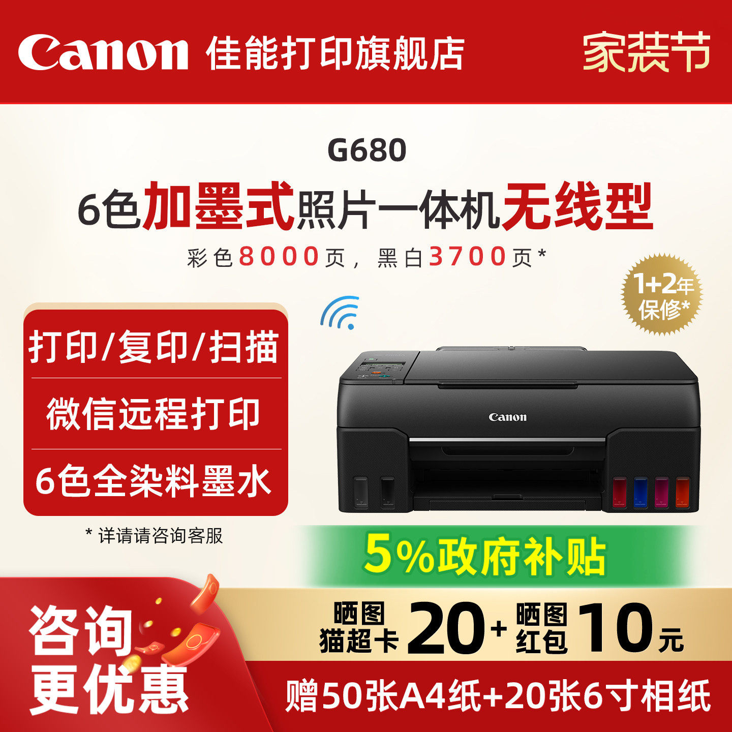 佳能旗舰店G580/G680原装加墨彩色A4喷墨打印复印扫描打印机一体机学生家用微信远程打印影楼6色照片可连手机