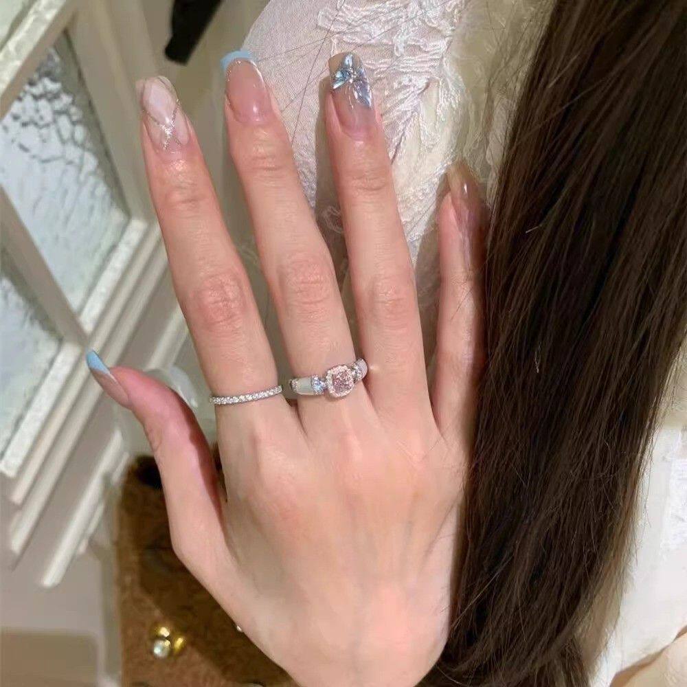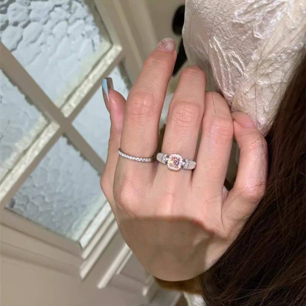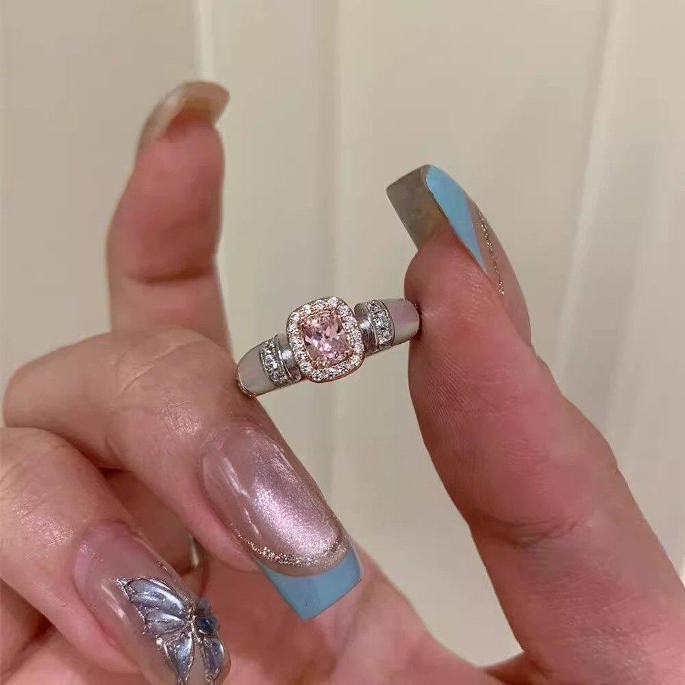中古vintage粉色方糖锆石戒指轻奢小众高级感食指戒名媛千金指环