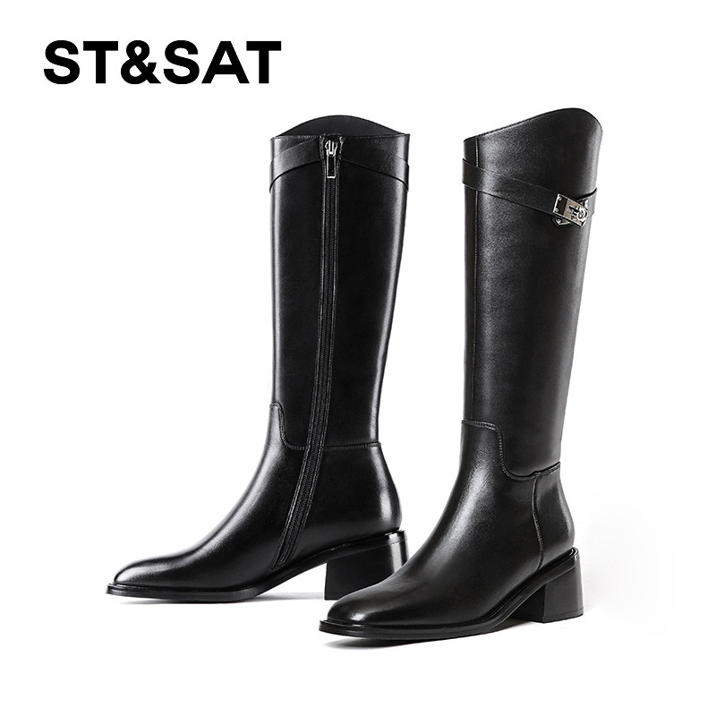 星期六英伦风斜口不过膝长靴女2025秋冬粗高跟高筒显瘦长筒骑士靴