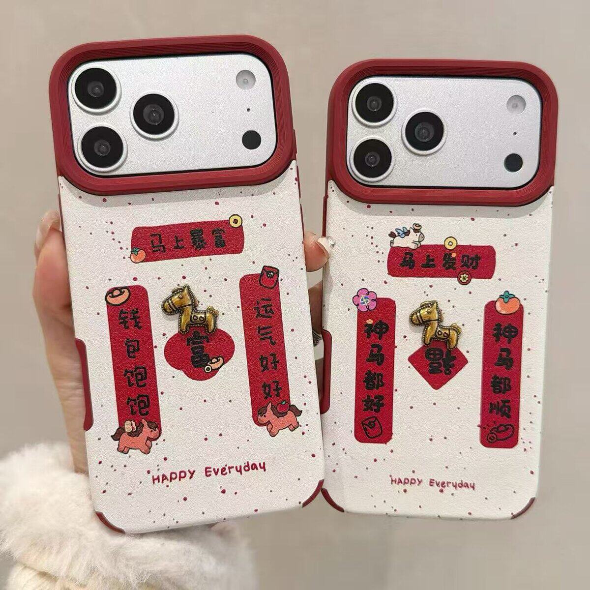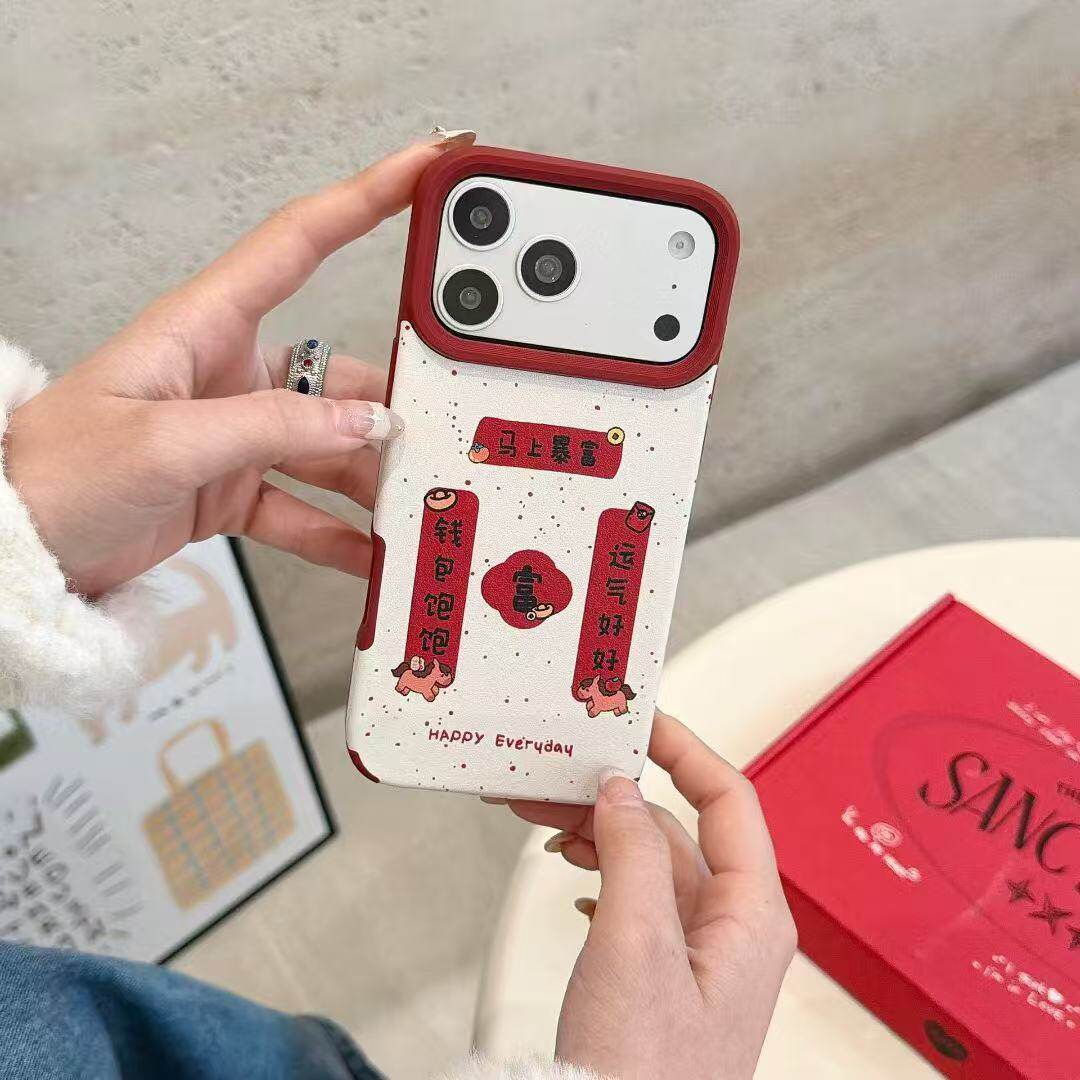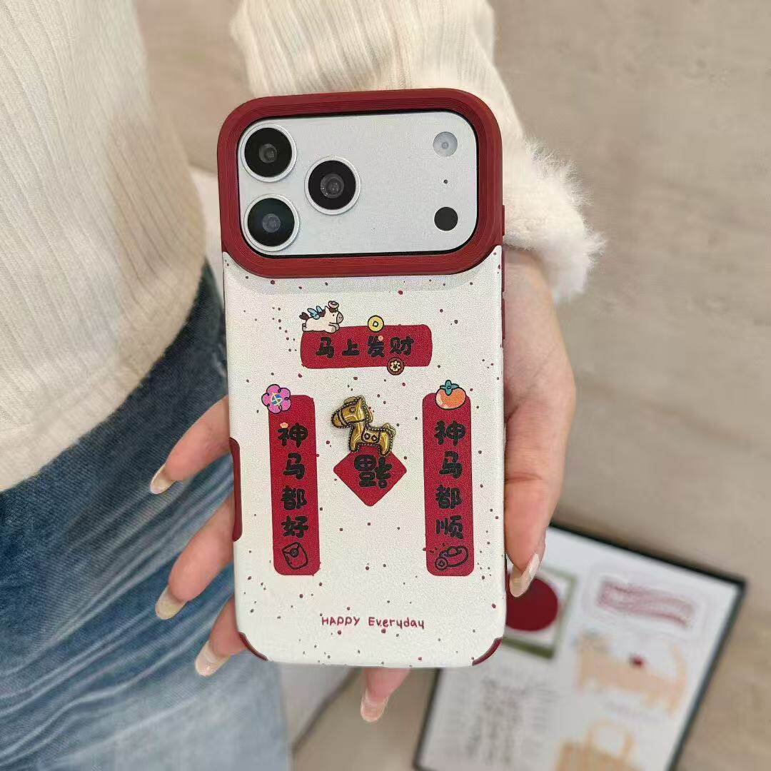 大孔酒红皮纹新年对联立体金马+马手链苹果手机壳适用17promax新年手机壳17Pro喜庆16新款15本命年红14马年13