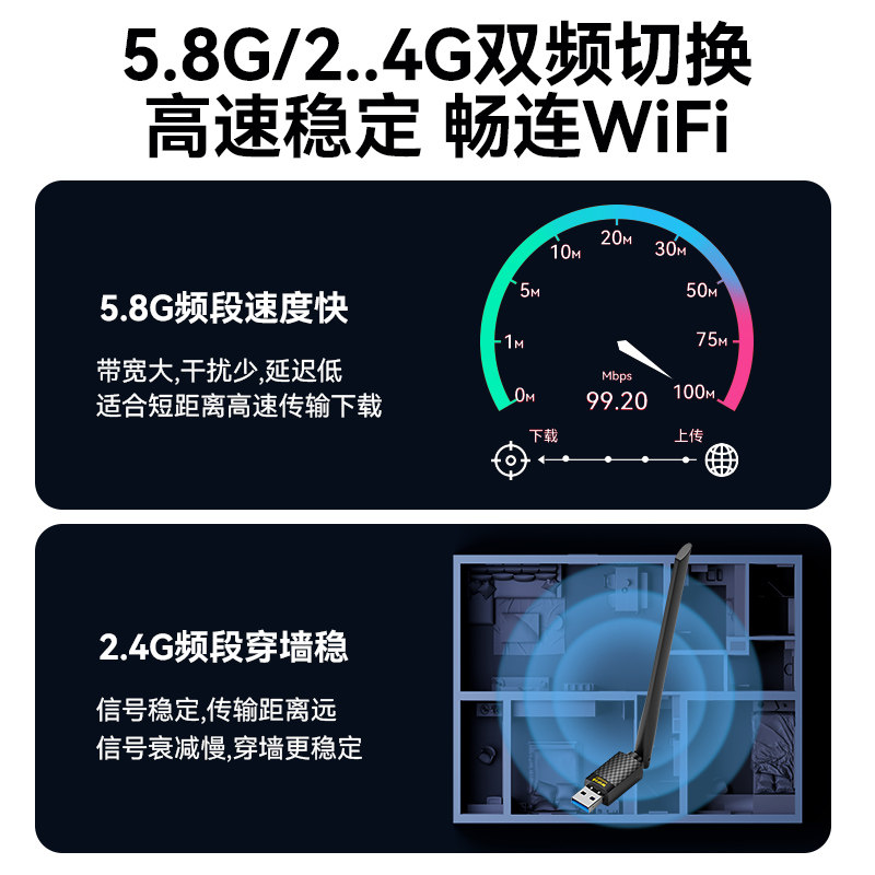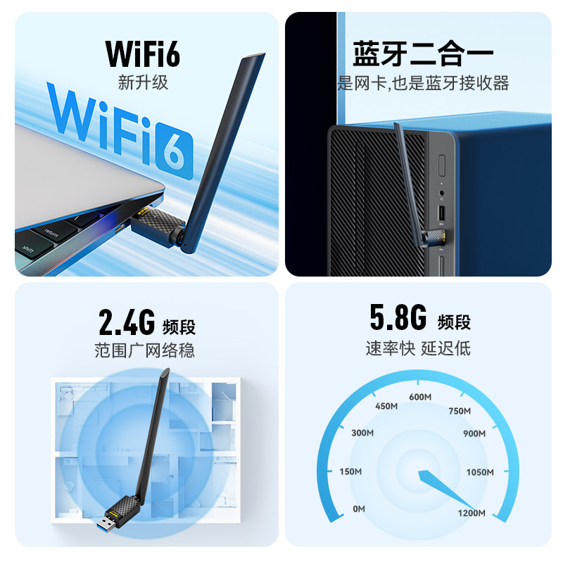 USB无线网卡双频免驱动内置WiFi高速千兆穿墙5G蓝牙二合一台式机笔记本电脑外置2026新款WIFI6网络信号接收器