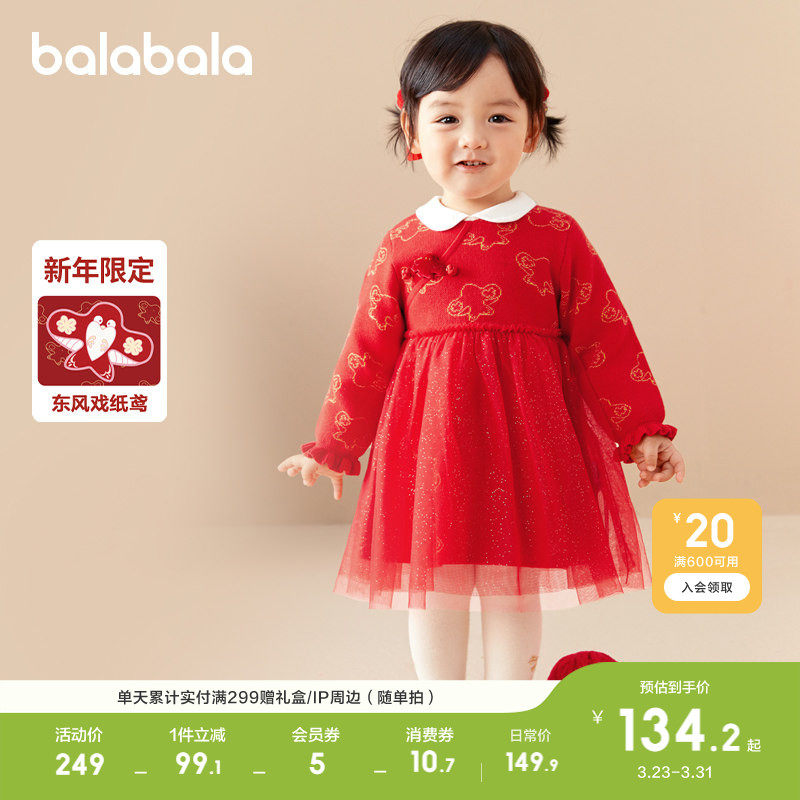 巴拉巴拉女童连衣裙宝宝拜年裙子冬装新款童装儿童红色洋气公主裙