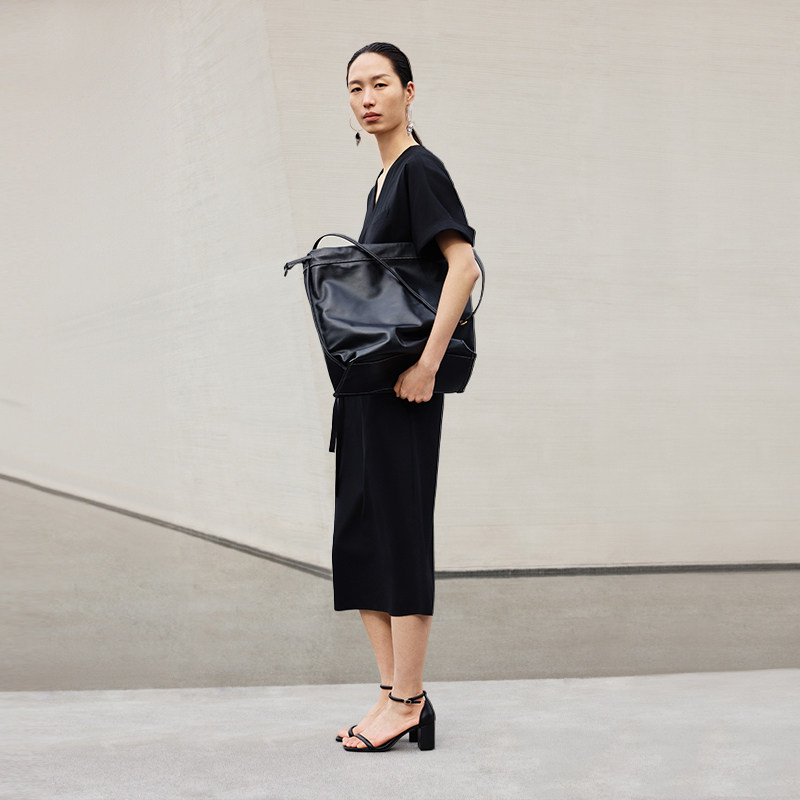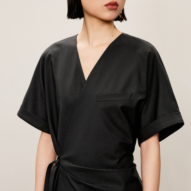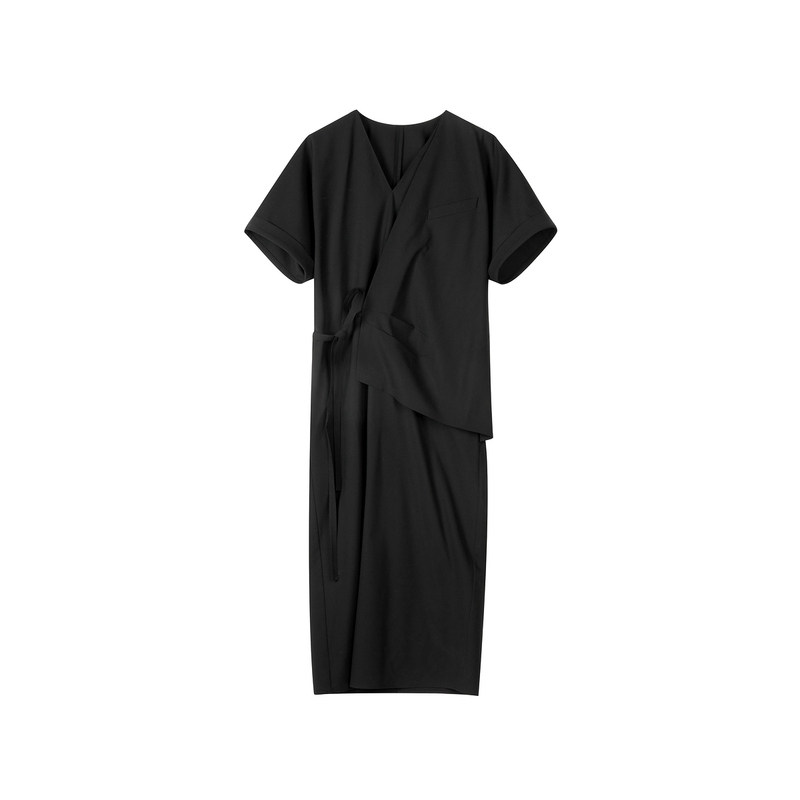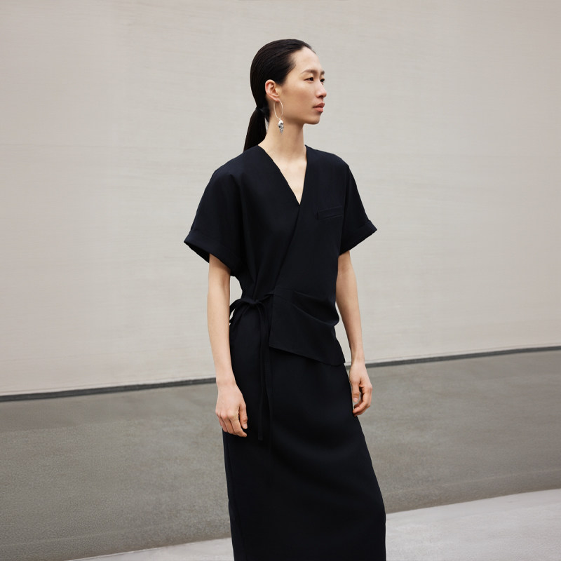 LESS春秋休闲收腰系带长裙女不规则极简优雅短袖连衣裙2O7G14770