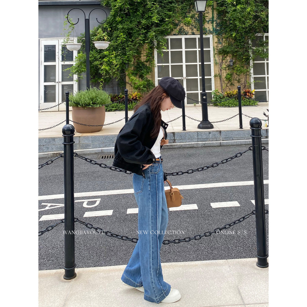 王家有鱼秋季新款2025复古蓝微喇牛仔裤中高腰不贴腿显瘦裤子女款