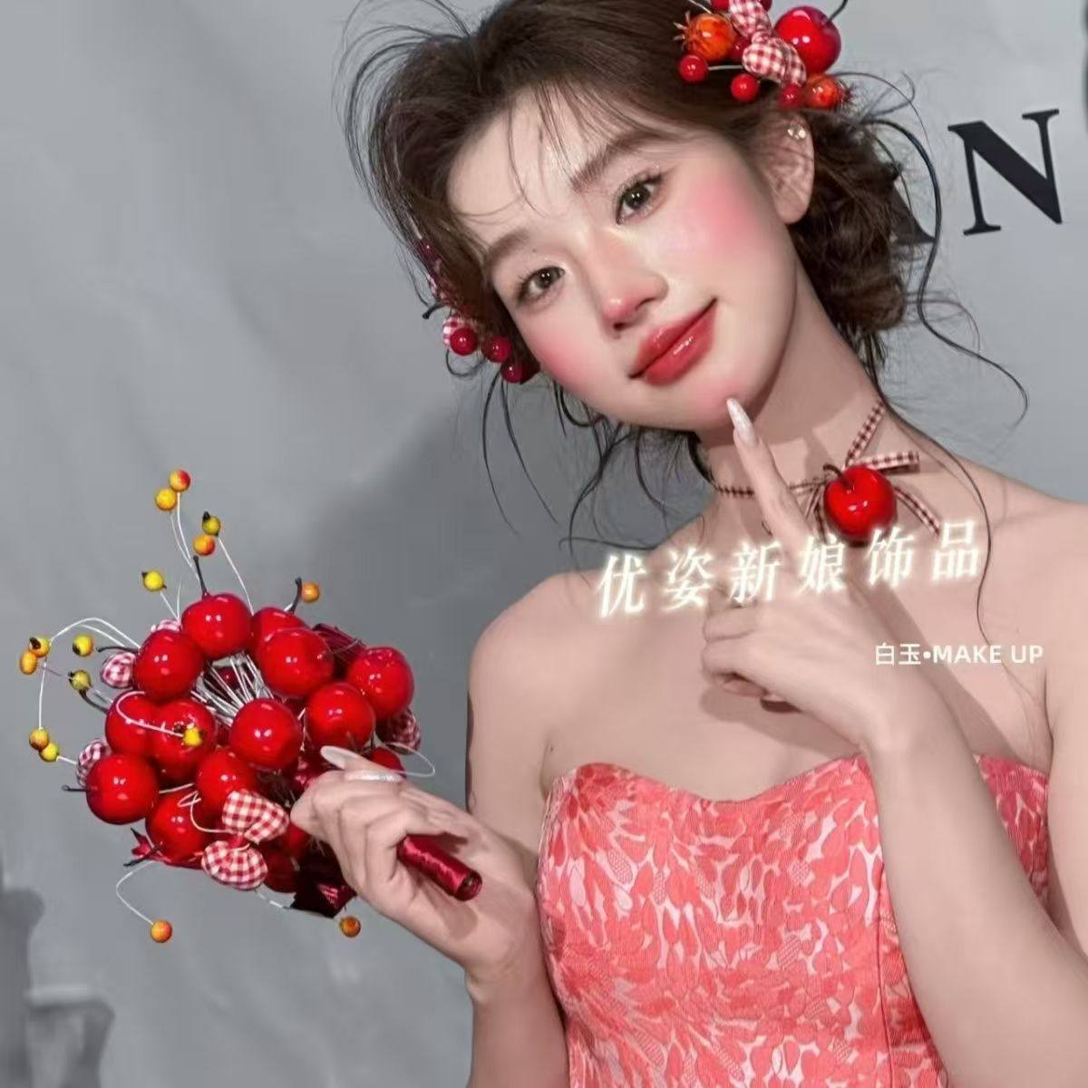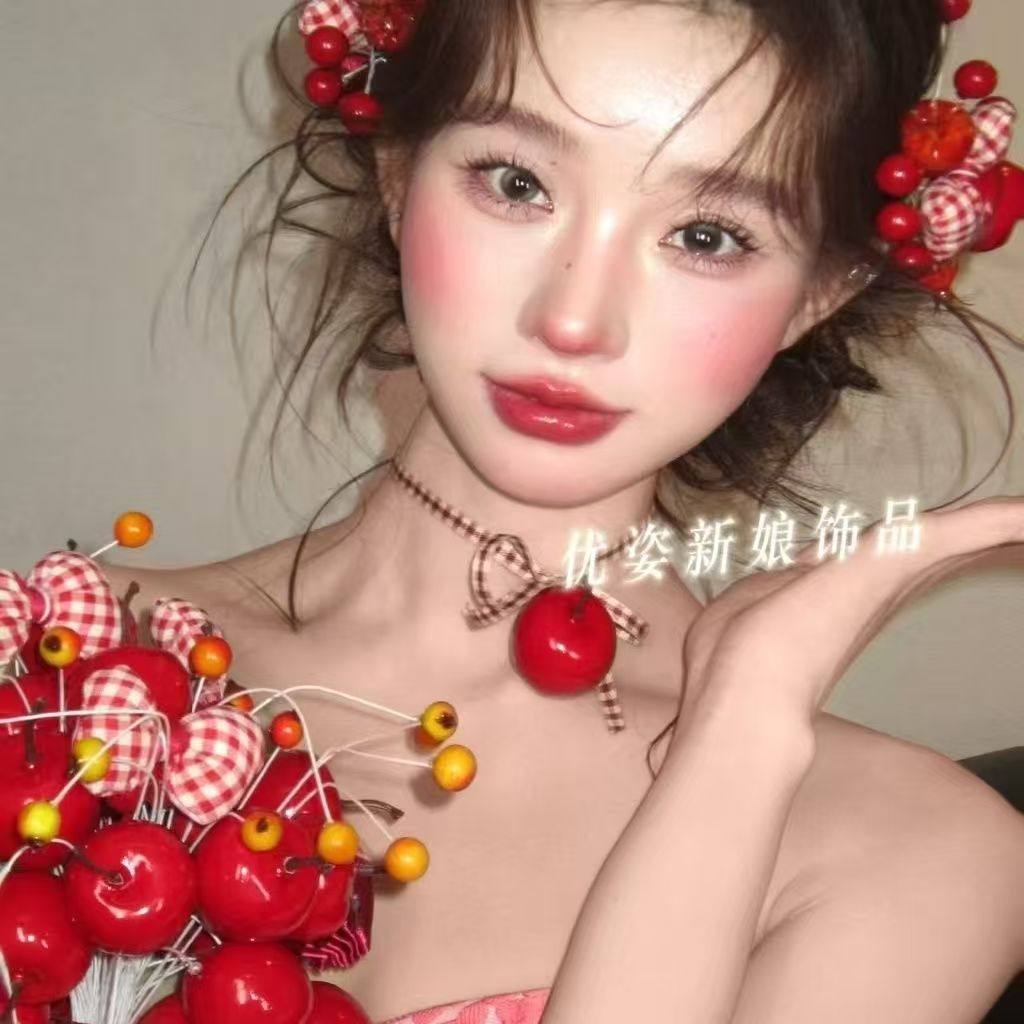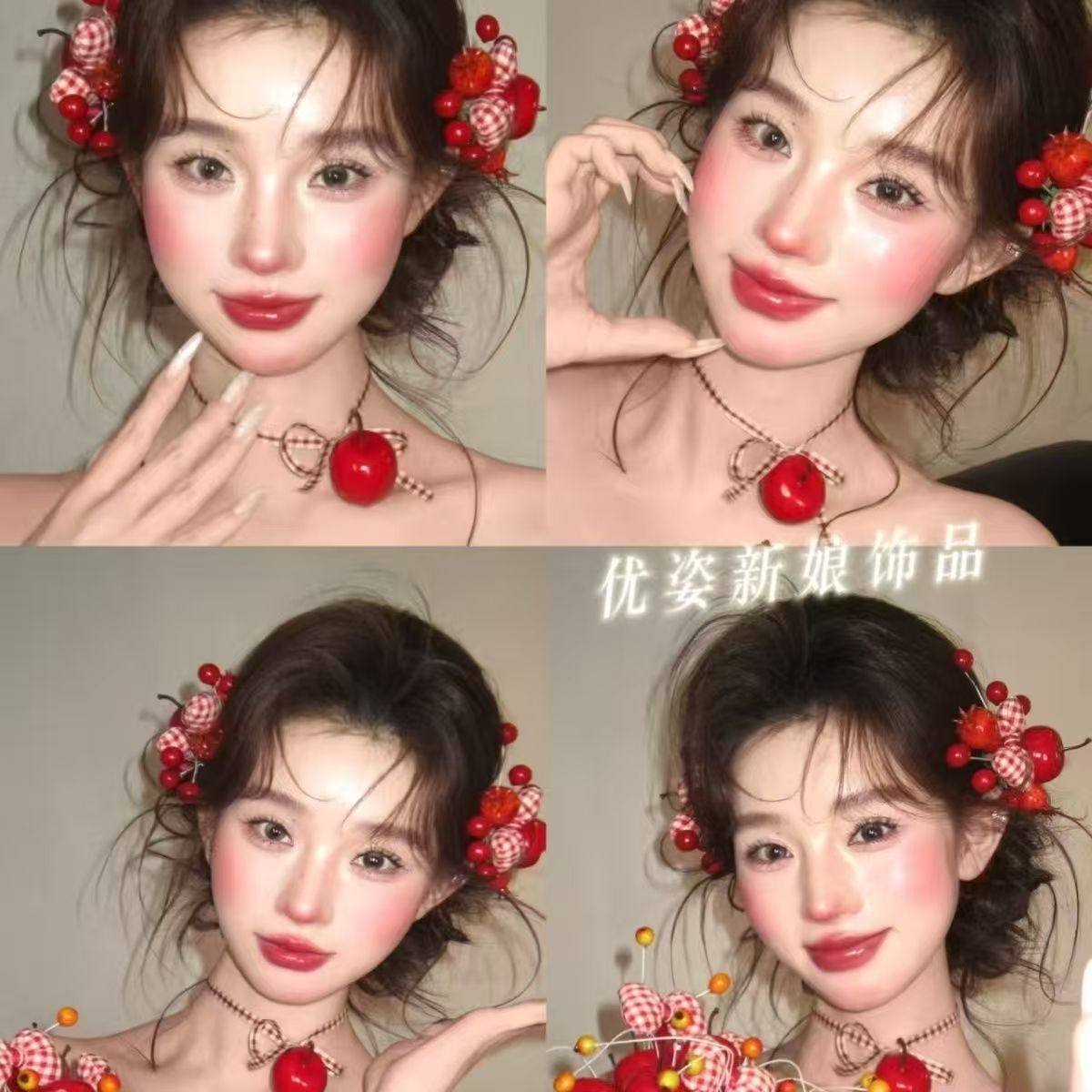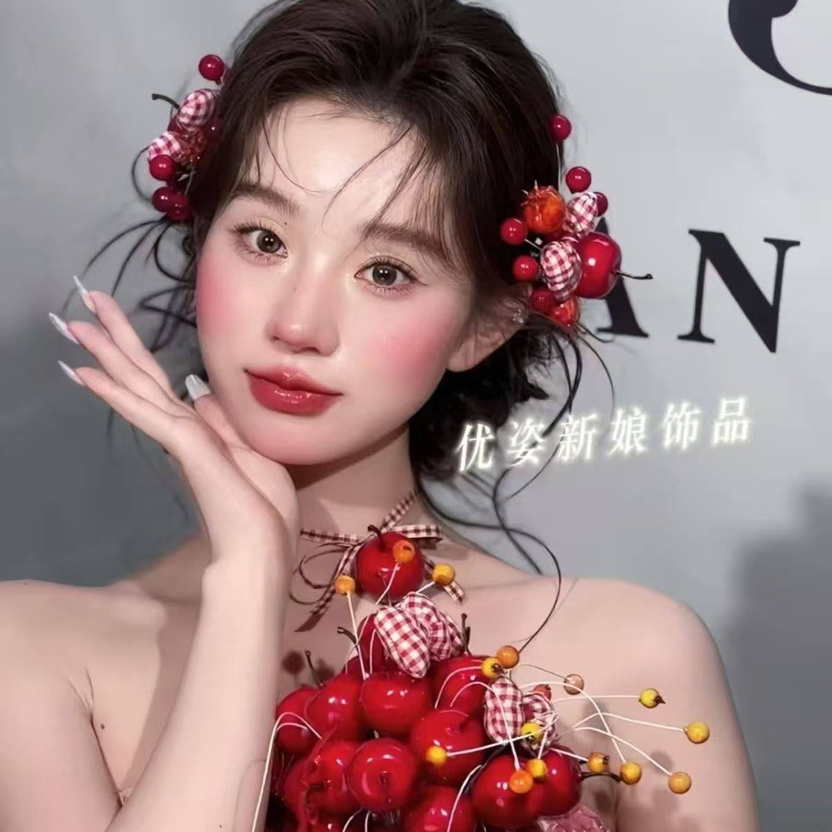 新娘新中式苹果石榴发夹新娘结婚订婚敬酒服甜美发饰头饰配饰