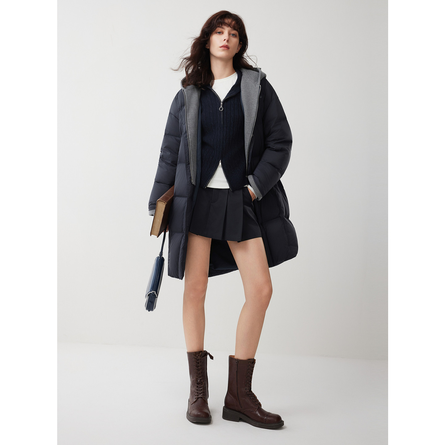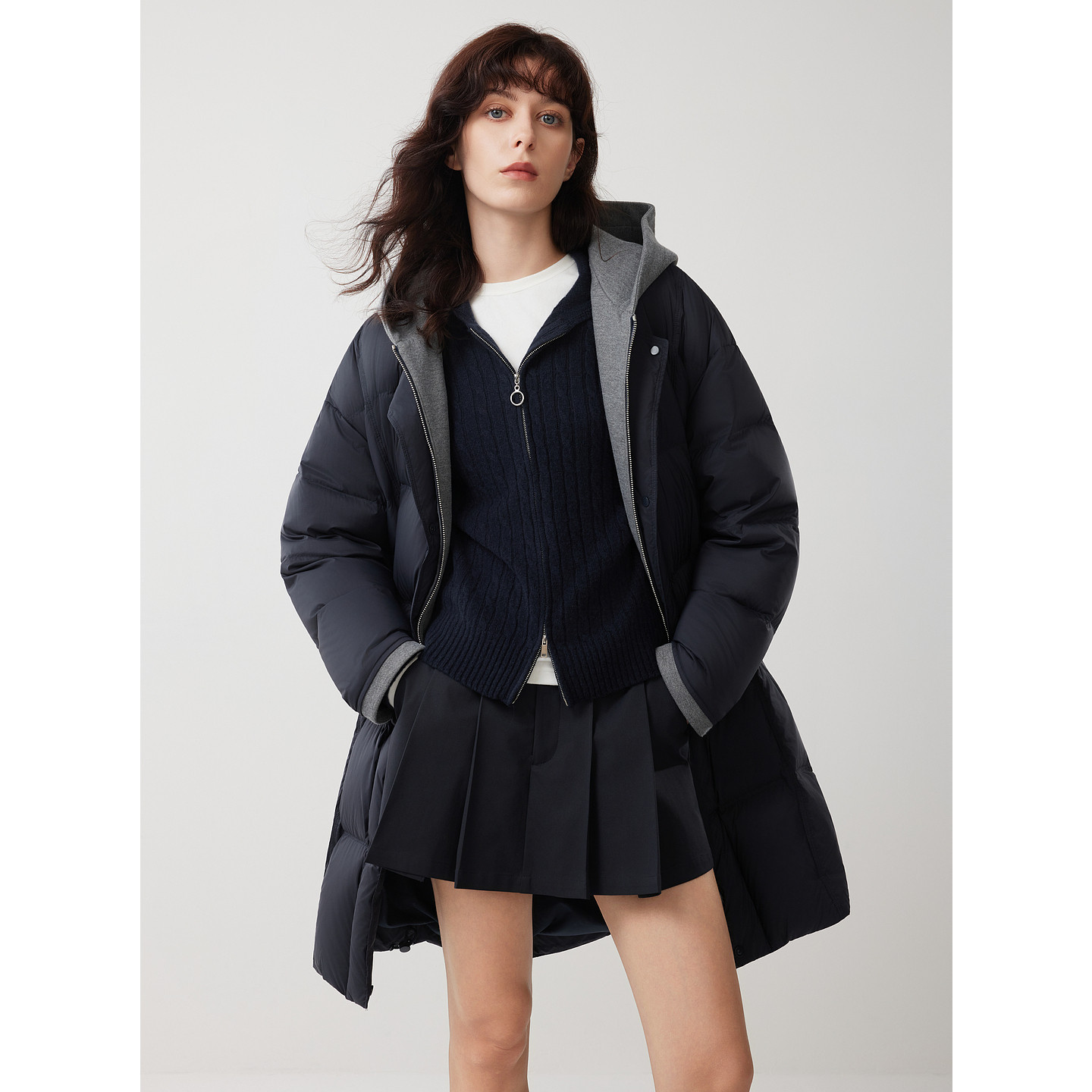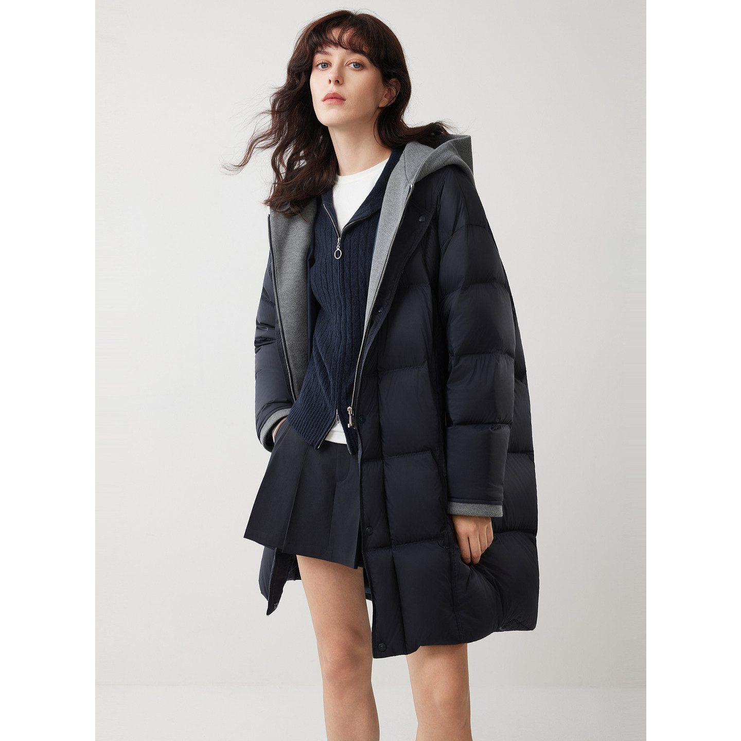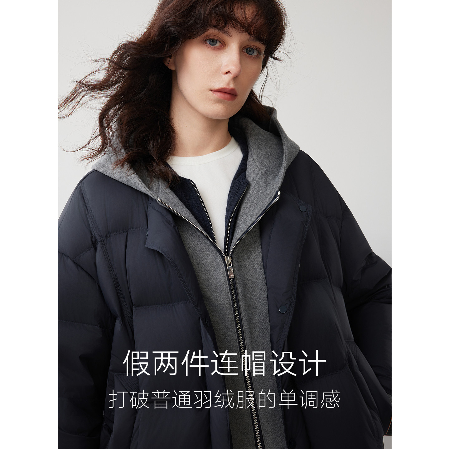 ELLE90白鸭绒假两件连帽长款羽绒服女2025冬新款加绒加厚保暖外套
