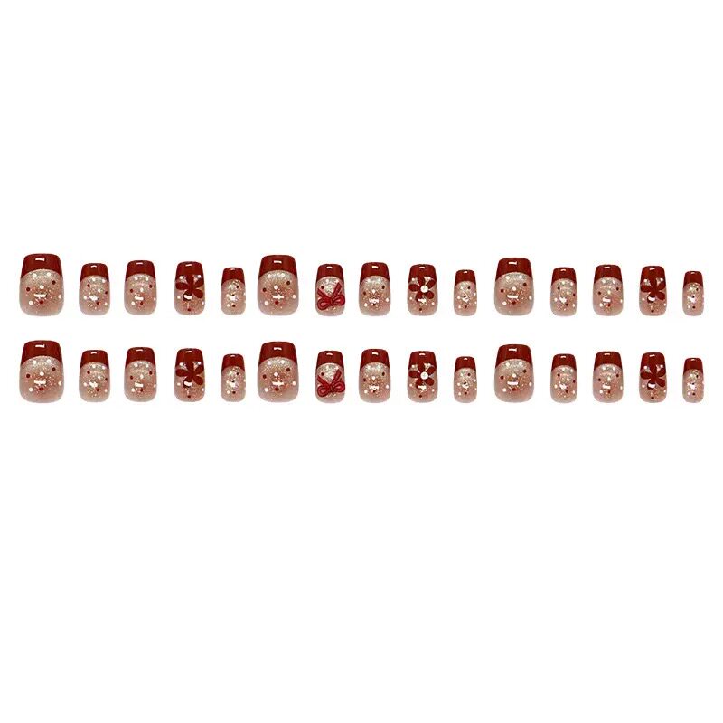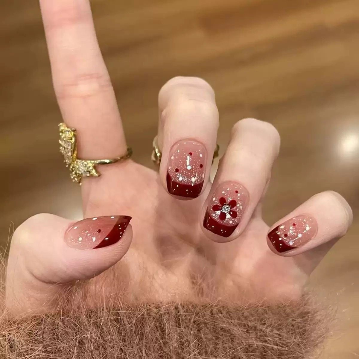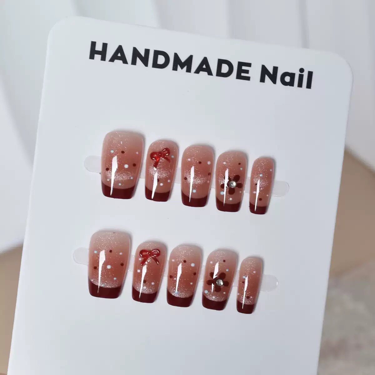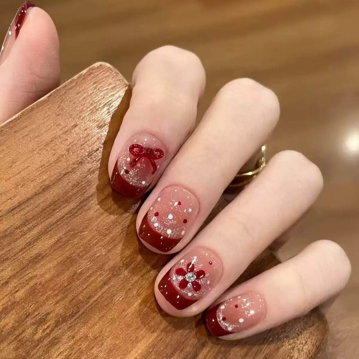春节过年酒红法式显白穿戴甲蝴蝶结爆闪猫眼新年美甲甲片千金黑皮