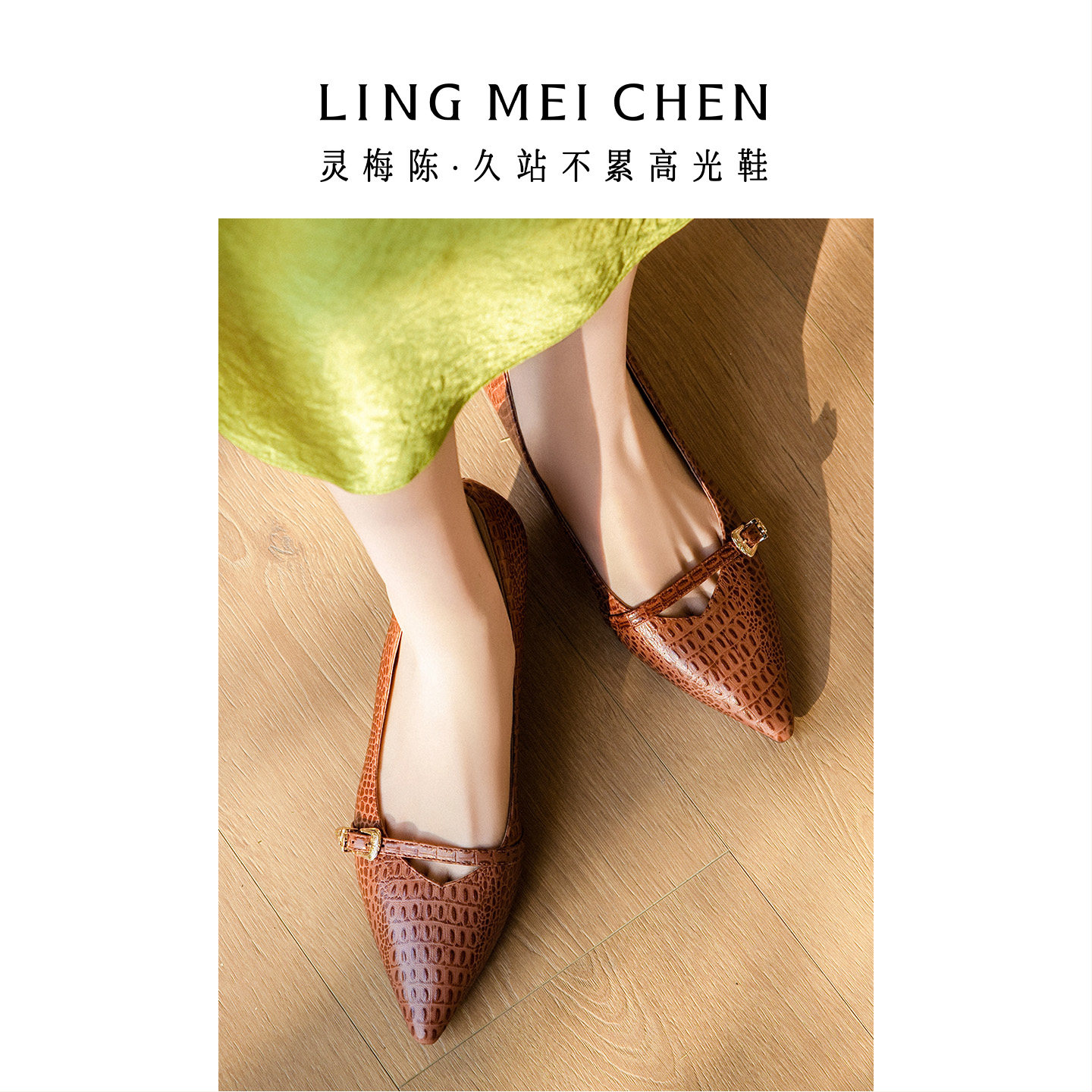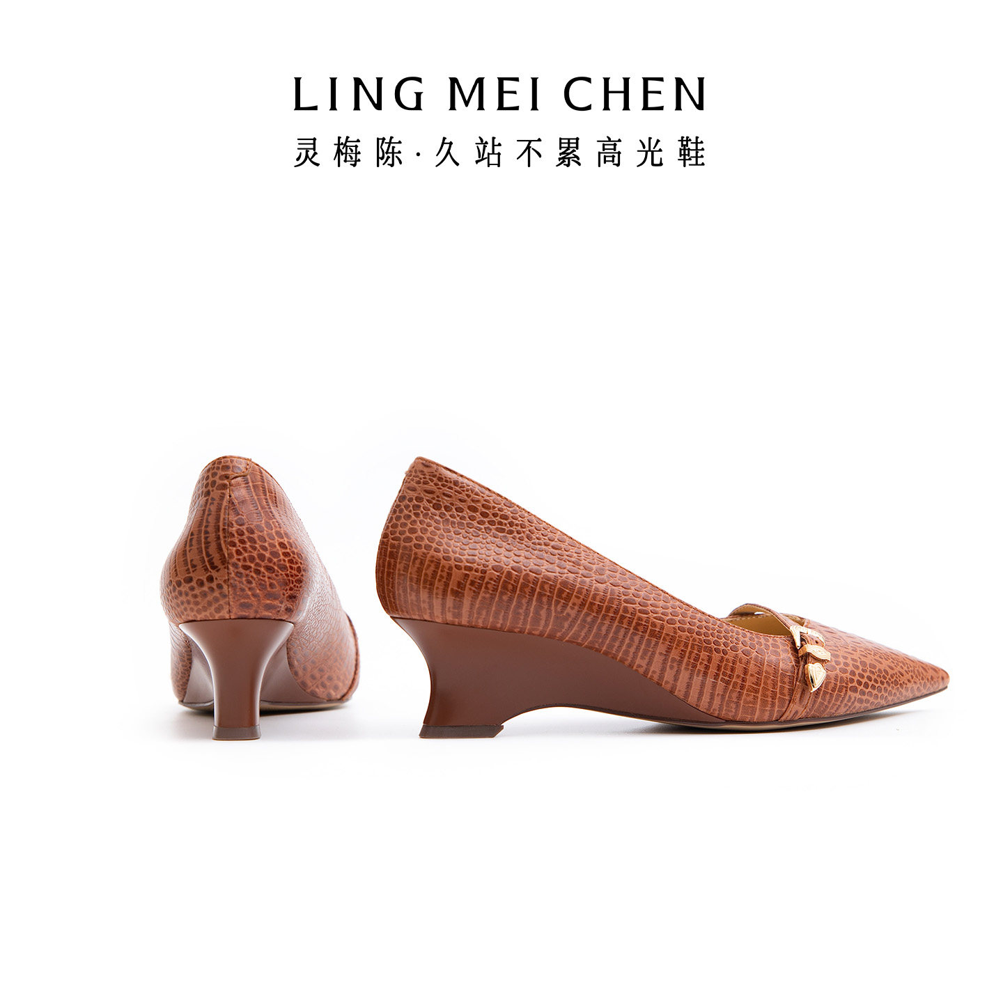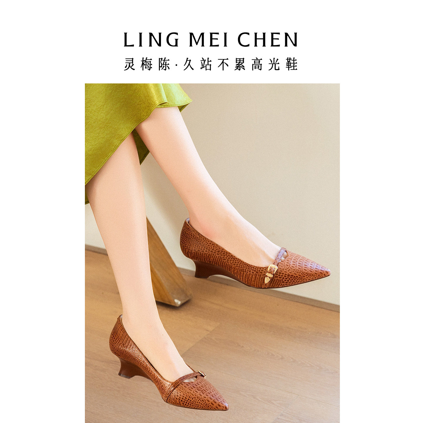 LINGMEICHEN坡跟高跟鞋2026春新款尖头皮鞋真皮压纹通勤单鞋女鞋