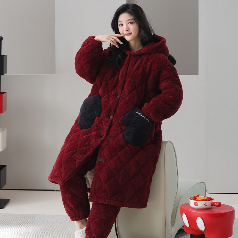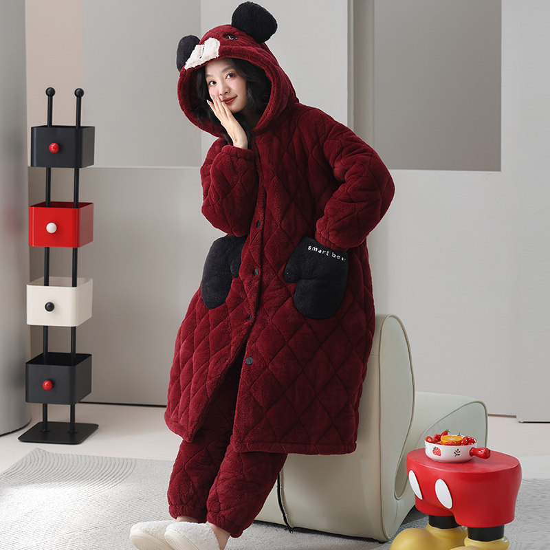 睡袍女冬季本命年新年新款加厚三层珊瑚绒红色加绒夹棉家居服睡衣