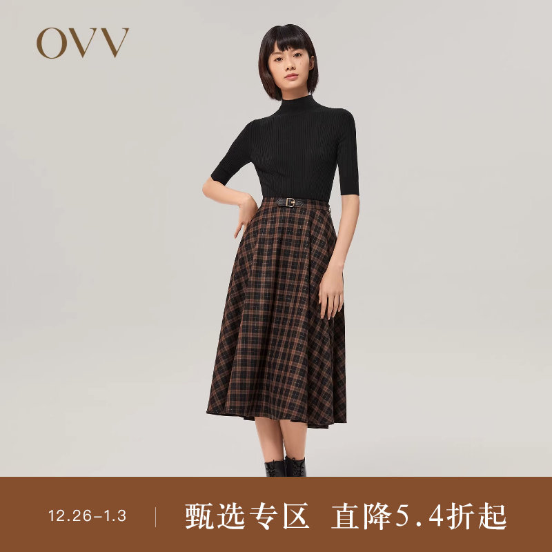 OVV秋冬女装简约复古优雅经典格纹皮扣半身裙伞裙