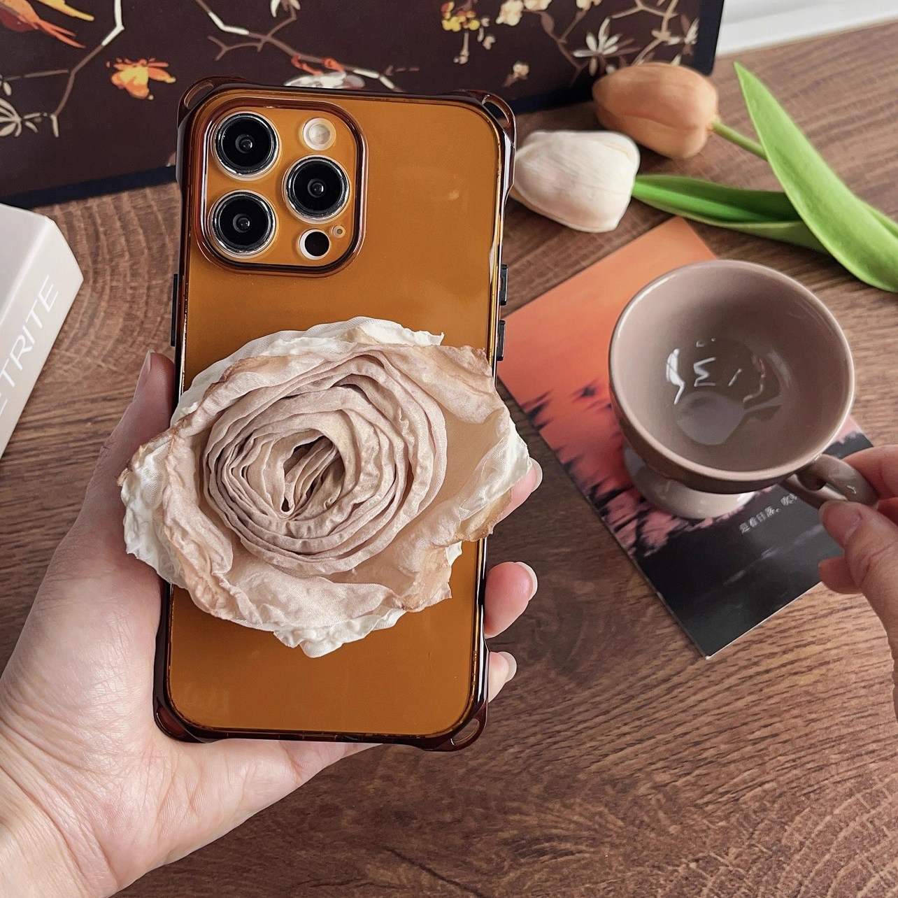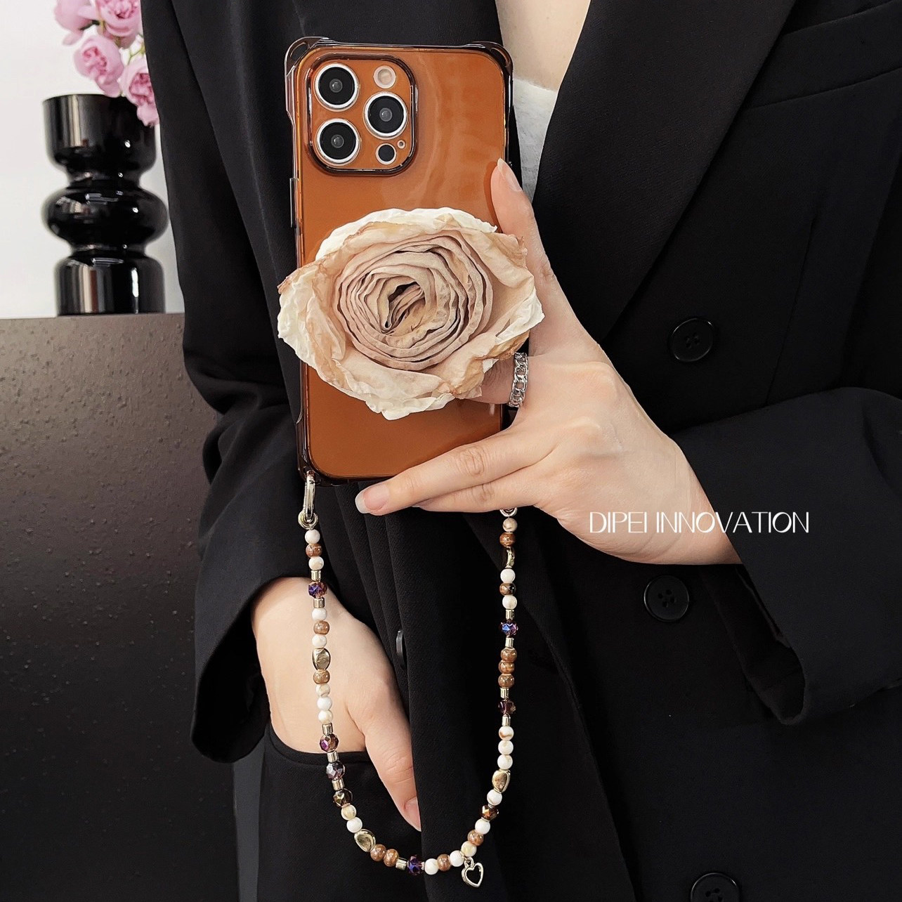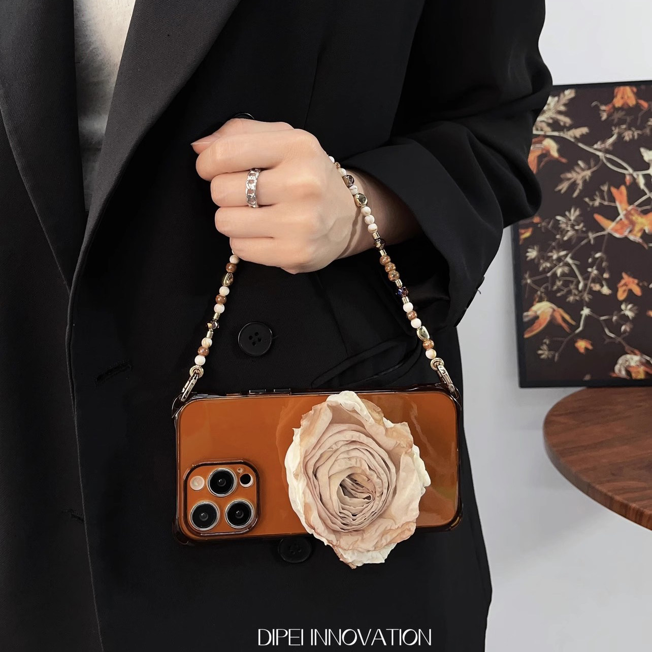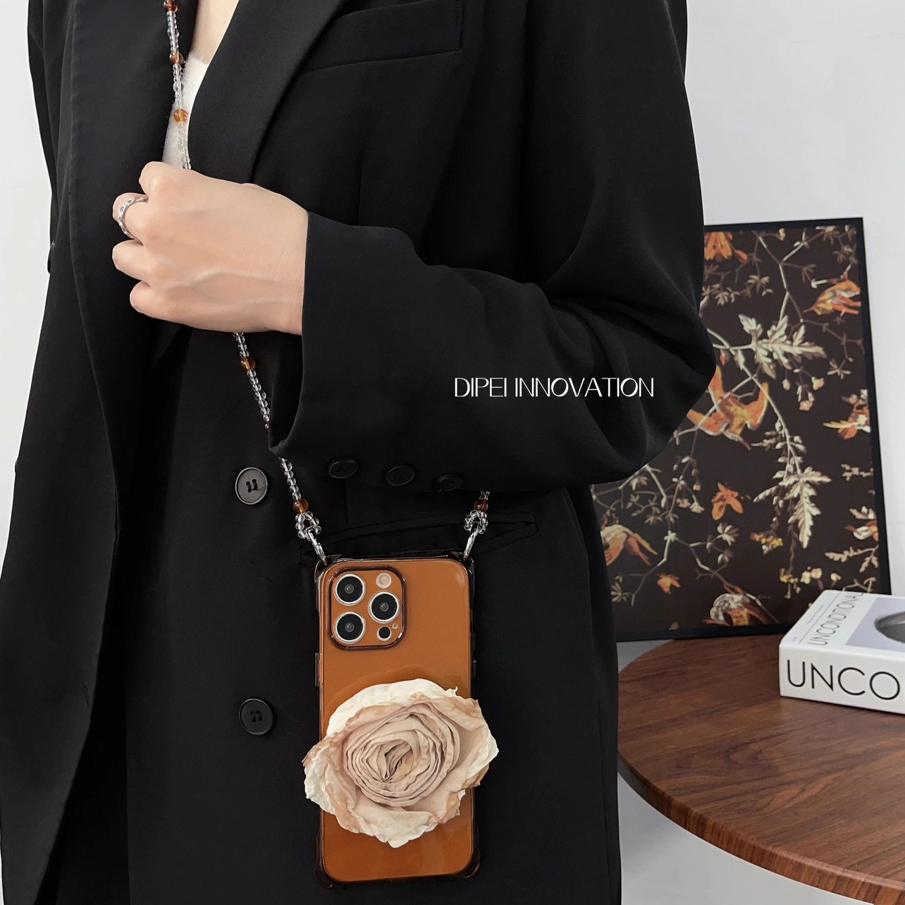 复古质感枯花支架手机壳链条15Promax斜挎适用苹果iPhone14plus手提12全包13防摔新款11四角开孔保护套女透棕