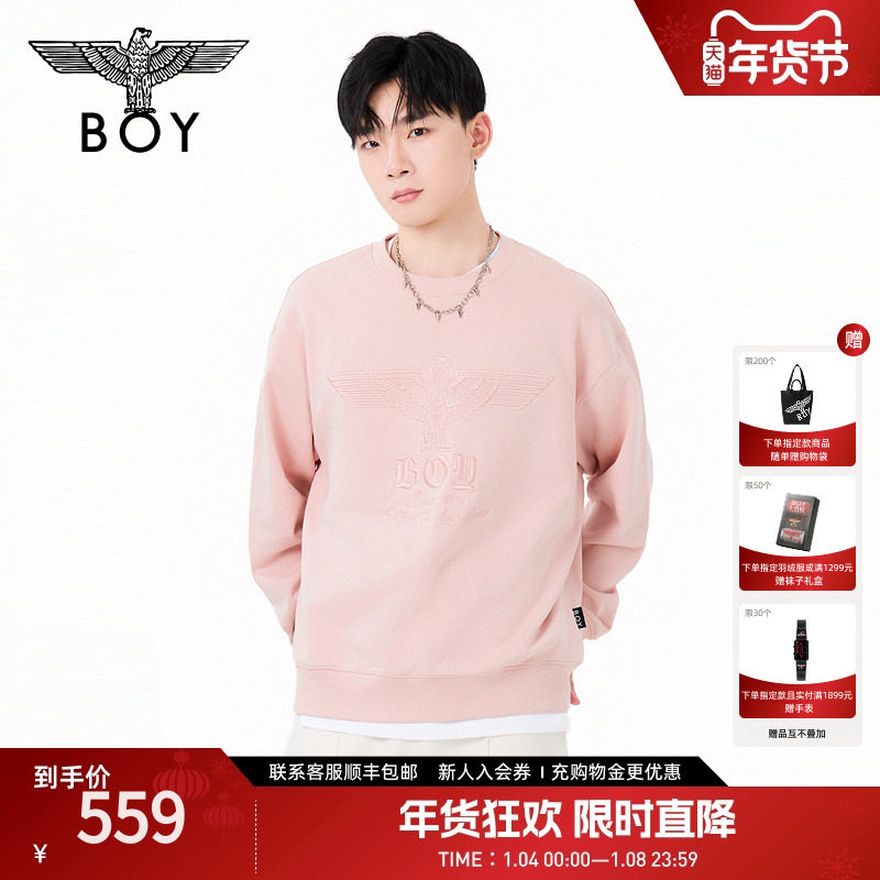 BOYLONDON春季男女同款粉色简约刺绣休闲潮牌圆领长袖卫衣N03804
